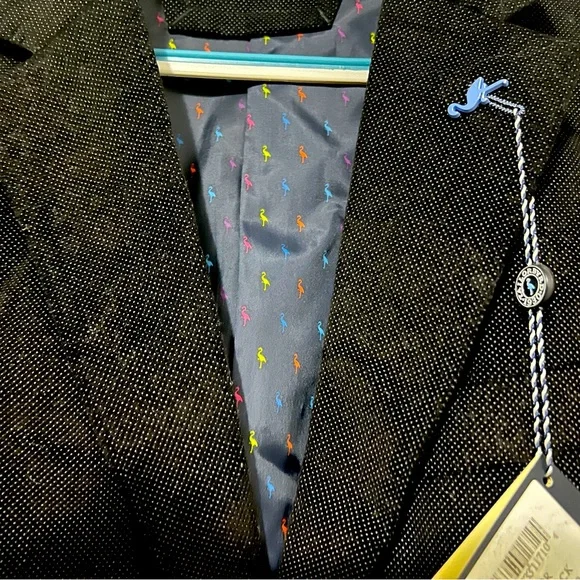 Taylorbyrd CollectionSize: 40RColor: black with blue inner lining with multi colored flamingo pattern