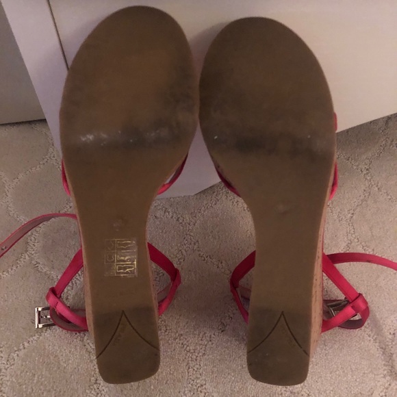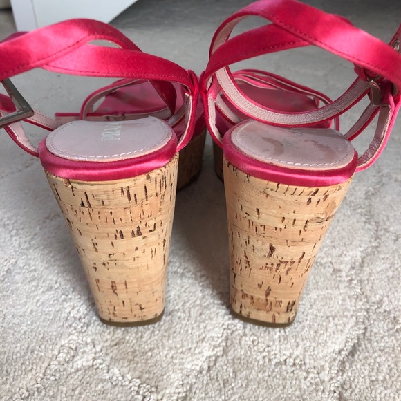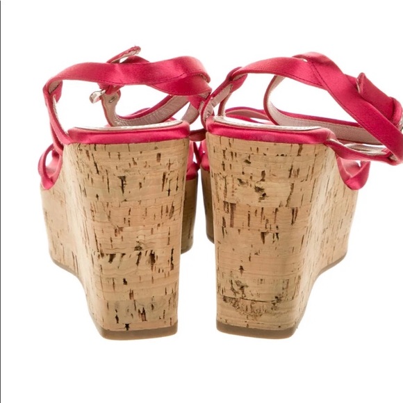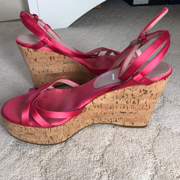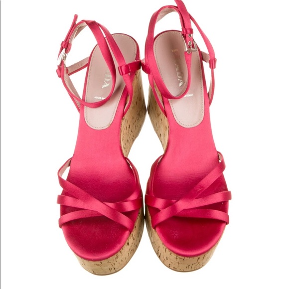 Like-New Prada Raso Satin Cork Wedge Sandal, Size 8.5. Worn only once to an event. Excellent preowned condition. Only slight sign of wear is on sole (see pics).Prada Fuschia Raso Cork Wedge Sandal. 100% Authentic. Fuschia Satin Straps lined in leather.Satin Footbed. Cork platform Wedge. Fits true to size.