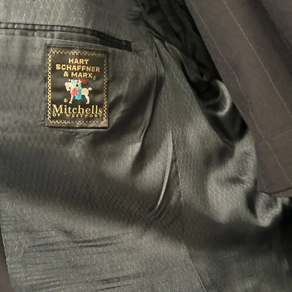 This elegant black suit from Hart Schaffner Marx is crafted for a sophisticated and professional look. Featuring a classic single-breasted design with notched lapels, it offers a timeless appeal suitable for formal occasions. The well-structured shoulders and clean lines ensure a polished appearance.