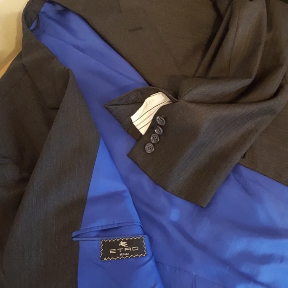 Etro tailor-made mens blazer. This bespoke jacket is amazing! The color is charcoal grey with a thin herringbone print. It has an awesome cobalt blue lining and a cobolt blue contrasting collar when flipped up. Working cuff buttons as well. Almost new!! Size is a US44L. Pit to pit is US 23. Made in Italy.