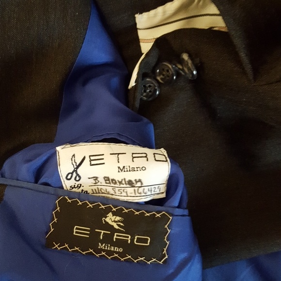 Etro tailor-made mens blazer. This bespoke jacket is amazing! The color is charcoal grey with a thin herringbone print. It has an awesome cobalt blue lining and a cobolt blue...