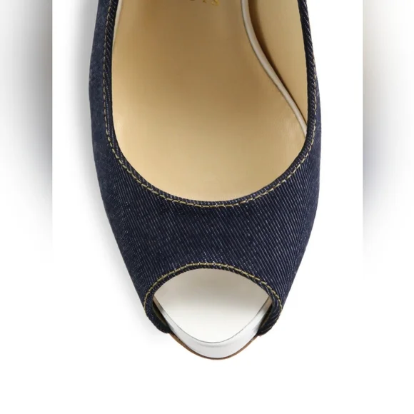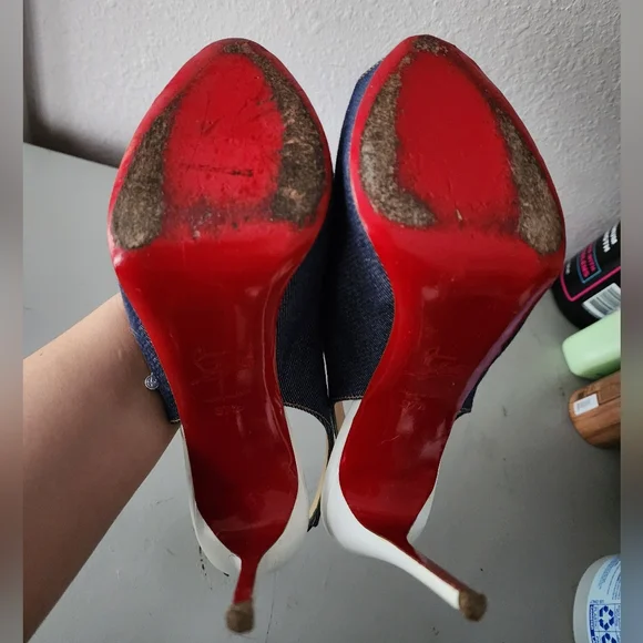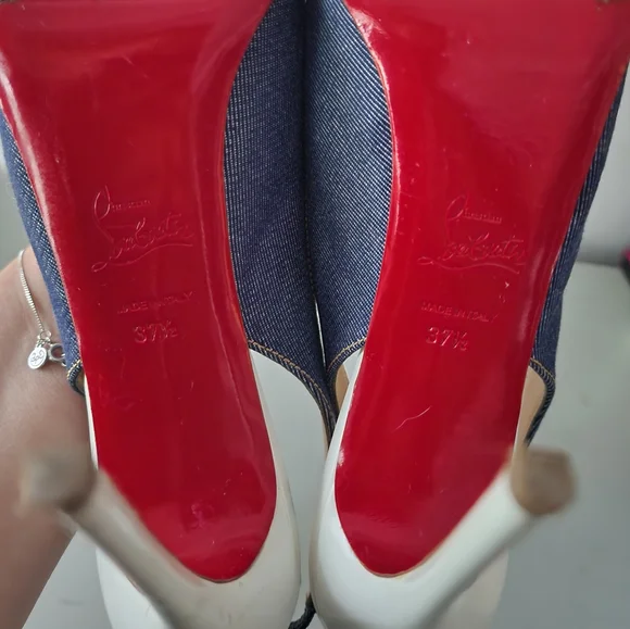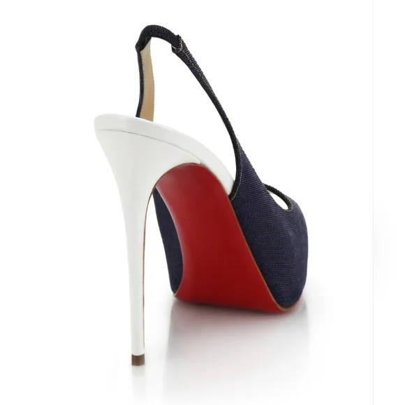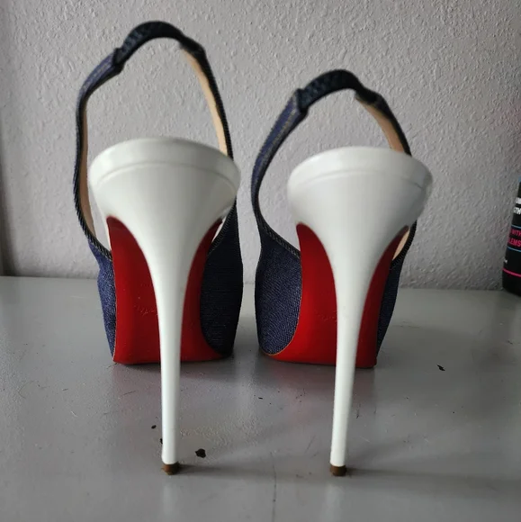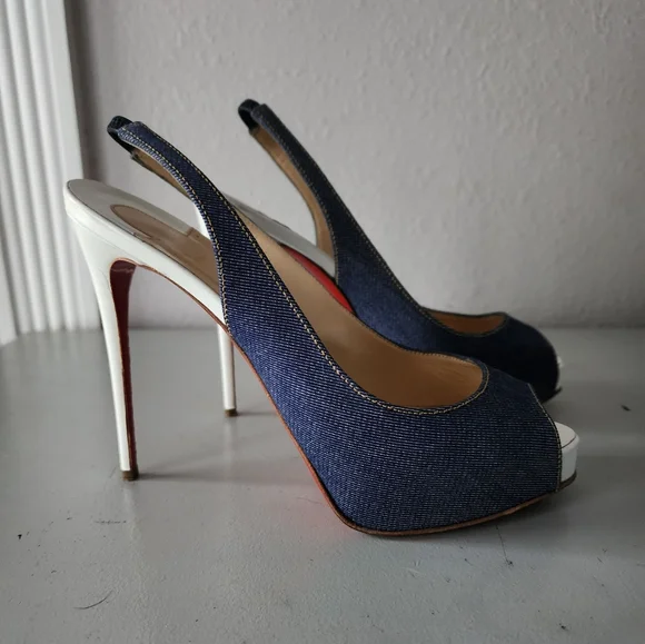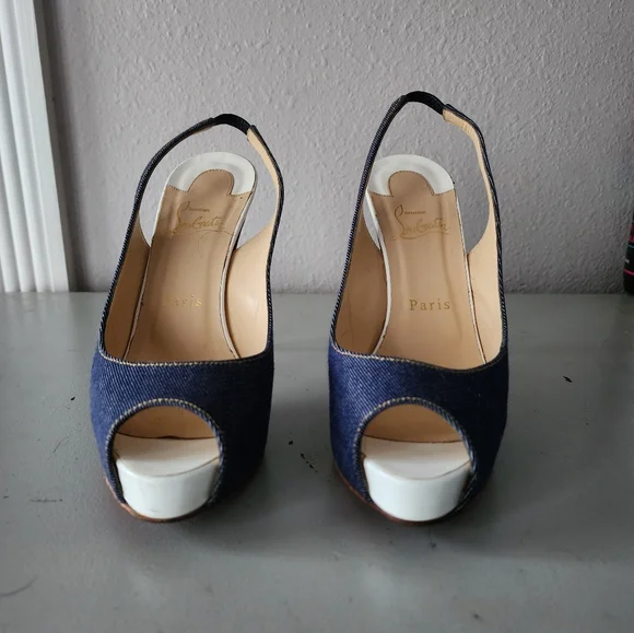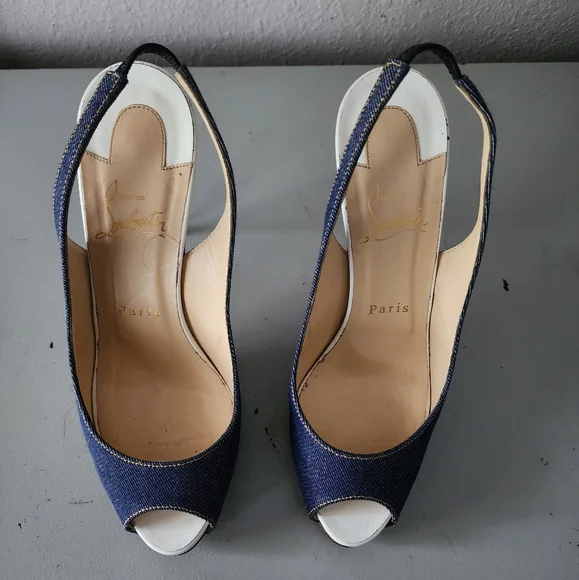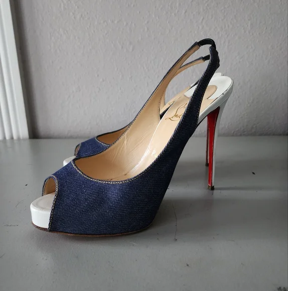 -glamorous peep-toe sling backs updated by cool tactile denim-leather-covered heel-4.75in heel (120mm)-denim upper -elasticized slingback strap-leather lining -signature red leather Christian Louboutin sole-padded insole-size 37.5 (US 7.5)-made in Italy -condition as shown -DOES NOT COM WITH DUST COVER OR IN ORIGINAL BOX!!!