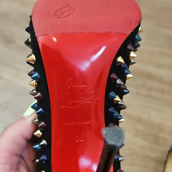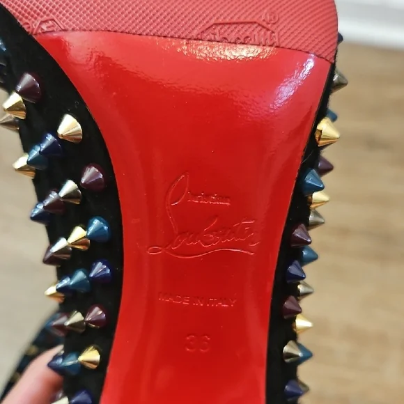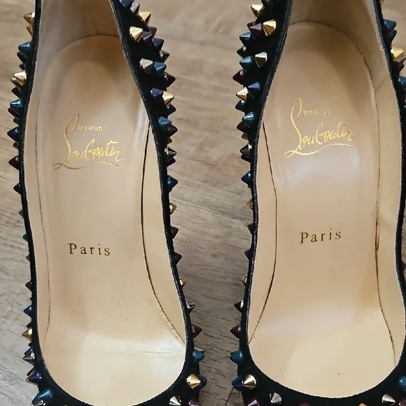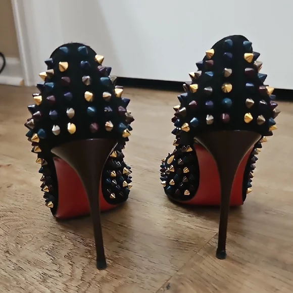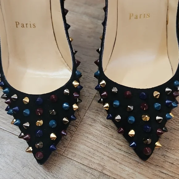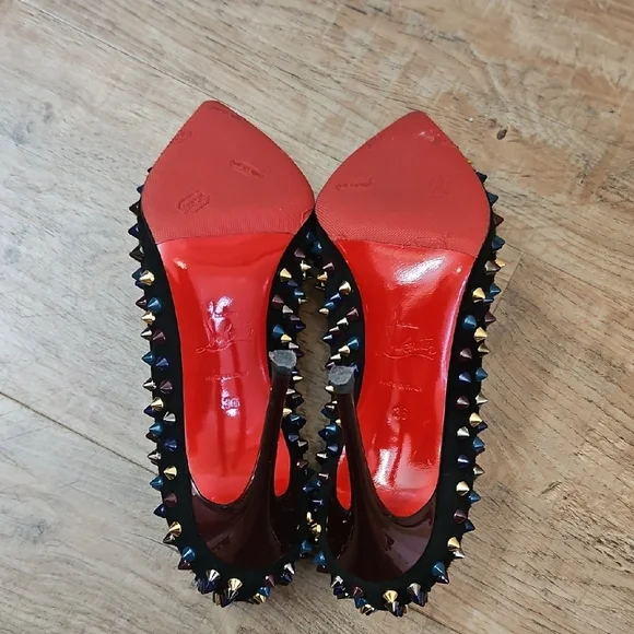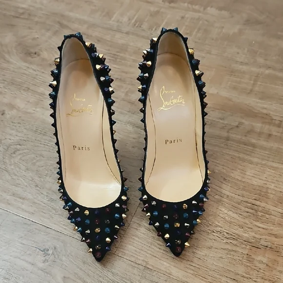 These striking black heels by Christian Louboutin feature a sleek patent leather finish adorned with metallic spike studs for a bold, edgy look. The pointed toe and high stiletto heel add a touch of sophistication, making them a standout choice for any occasion.