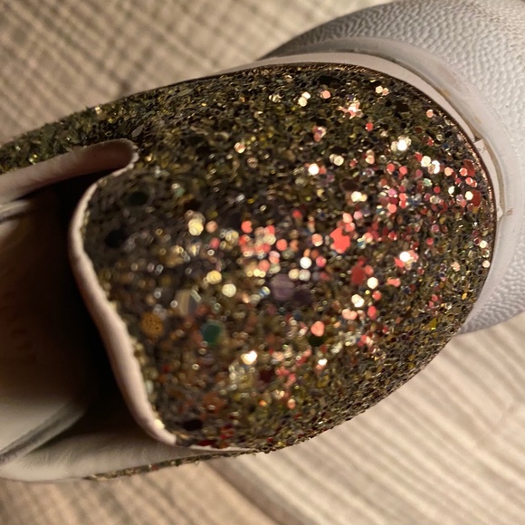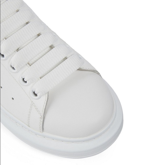 White soft calfskin lace-up sneaker with a gold glitter heel counter and a white oversized rubber sole. The sneaker features large flat white laces and Oversized rubber sole with signature stamp design. Size 35,5EU