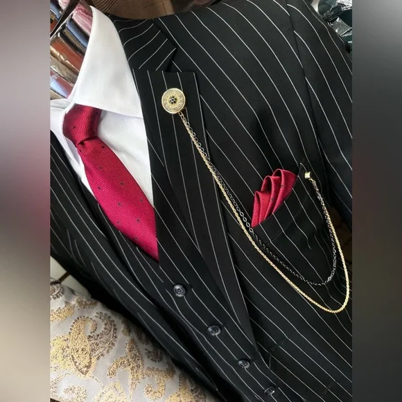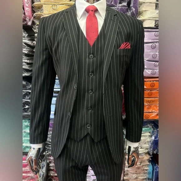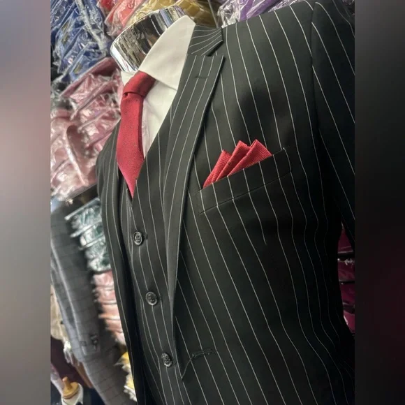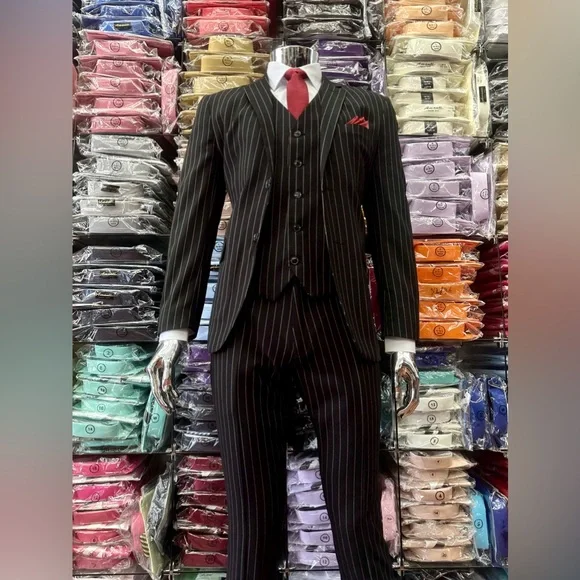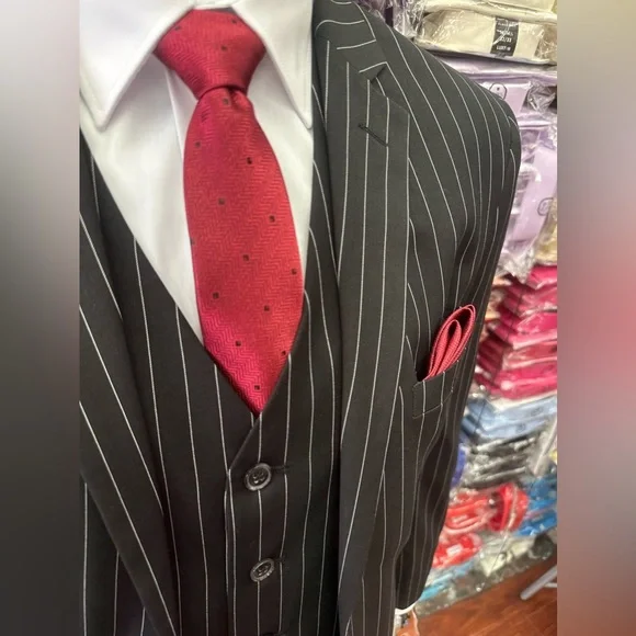 Mens Premium Black & White Pinstripe 3 Piece Suit Set Includes 9 Pieces Accessories SetHigh quality fabric, light weightIncludes, jacket, vest, pants, shirt, tie, hanky, socks, lapel chain and garment bag We have all sizes available! From 34S-62R Please send us a message, with your suit and shirt size! Please let us know if you have any questions or if you need help figuring out your perfect suit sizeOBO