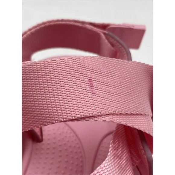 -Sharpie stains on bottoms -Sharpie stain on left sandals upperElevate your style with these beautiful Alexander McQueen Tread sandals in pink. Crafted with a combination of...