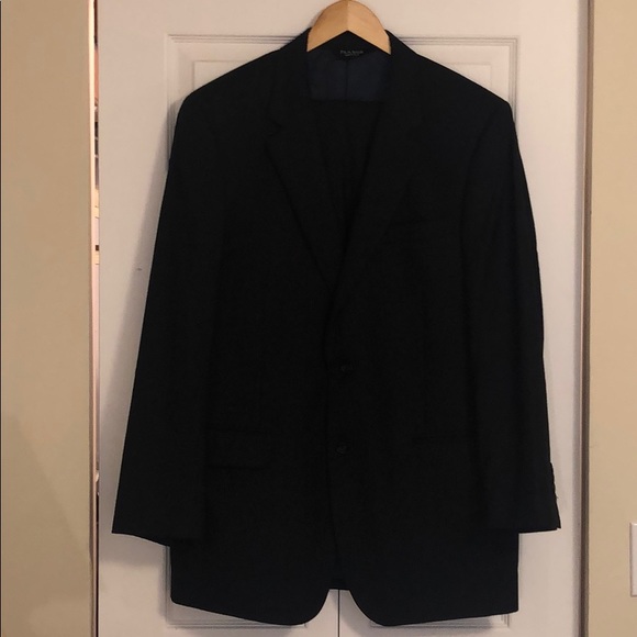 This Slim Fit suit has a pin striping pattern, a fully lined jacket that features a peak lapel, two-button closure, flap-front pockets, side vents and interior pockets. The flat-front slacks are half-lined to the knee and are unhemmed for tailoring. This suit is using comfort technology that keeps you cooler with natural-cooling minerals, a special fiber core that increases moisture wicking, an enhanced airflow to boost cooling so you feel fresh. Dry clean only.Gently used, owner lost weight.