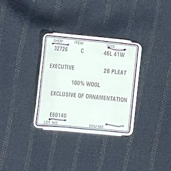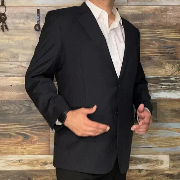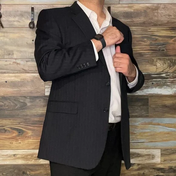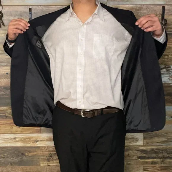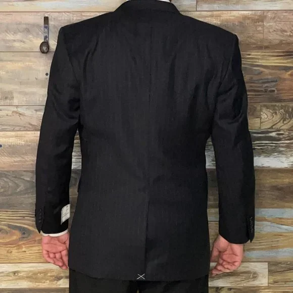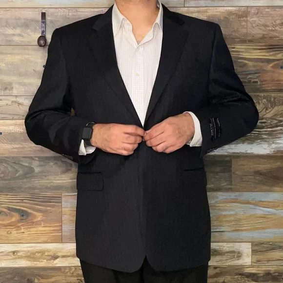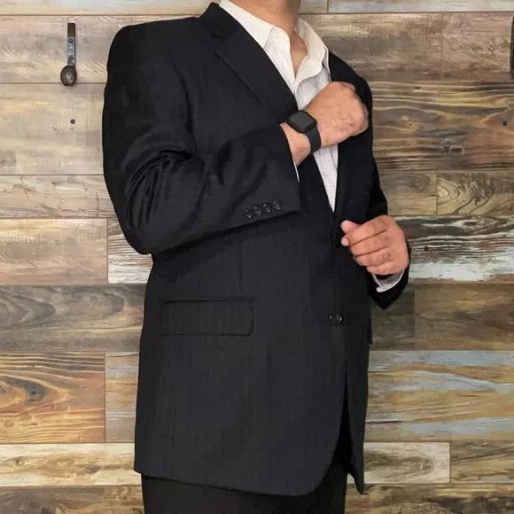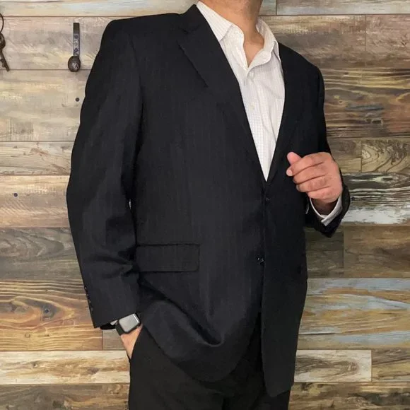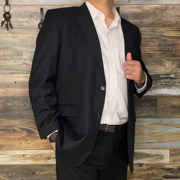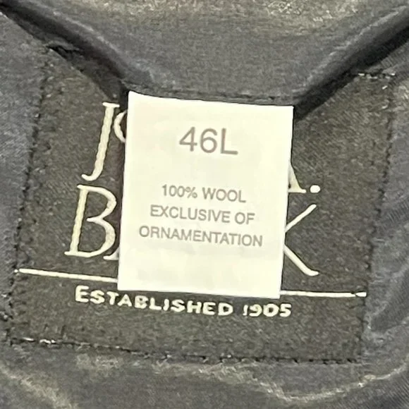 NWT Jos. A. Bank Executive Collection Wool Black Striped Blazer Sport Jacket 46LExcellent ConditionDesigned & MadeSize: 46L Size Comments:General Comments: Excellent Condition, Please review the measurements provided below.- DetailsModel: 2-Button front closure, Single rear ventAppropriate to wear: Summer, Spring, Winter & FallFabric content: 100% Wool Color/Pattern: Black, SolidInterior pockets: 2Lining: fully-lined, Black satin- MeasurementsPit to Pit: 24 1/2"Shoulders at widest point: 20 1/2"Sleeve length from top of shoulder: 26 1/2"Length from bottom of collar: 33"