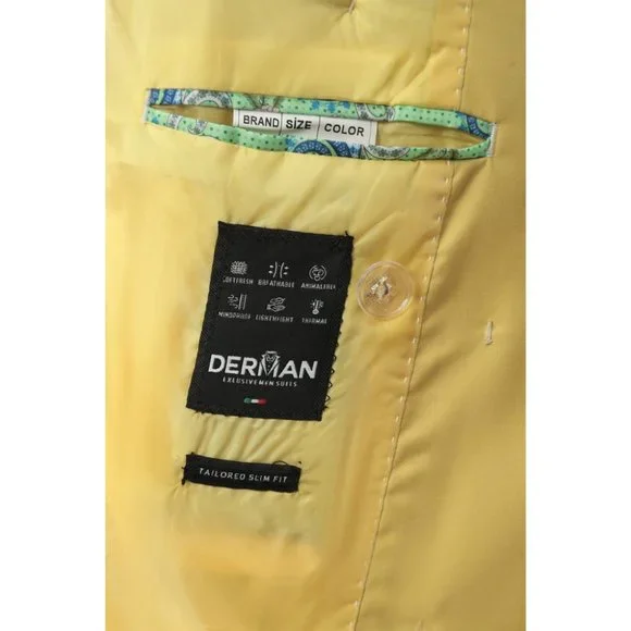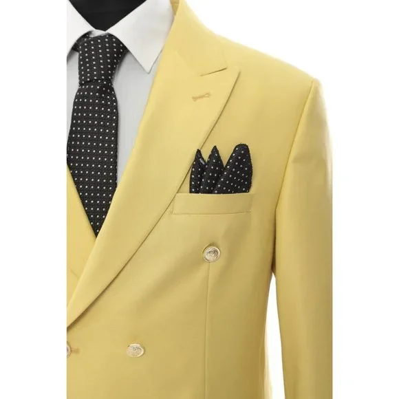 Derman Double Breasted Yellow Royal Series SuitThis model, which has a royal stance, has been prepared in a way that will make you feel special with its luxurious fabric and wonderful workmanship. Stylish design that you can use on all your special occasions and daily.FeaturesJacketDouble VentilatedTwo Buttons On The Front2 Functional Inner PocketsLined Matching Pocket SquarePantsHook and Rod Extension60% Polyester 40% ViscoseDry clean only.