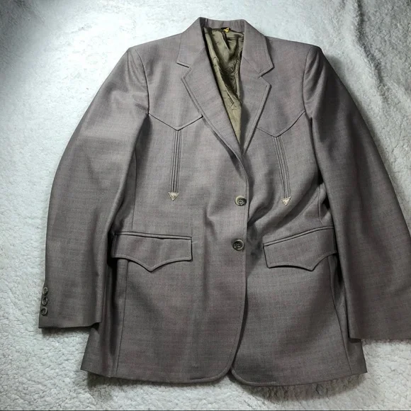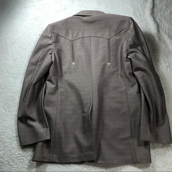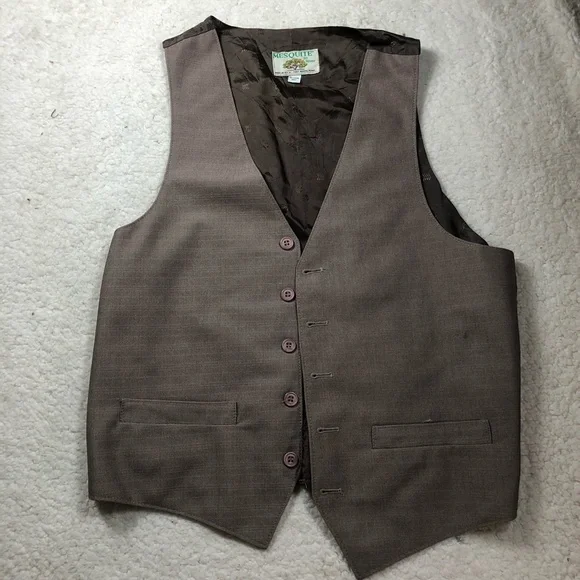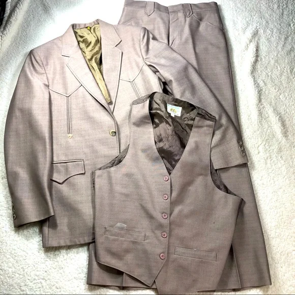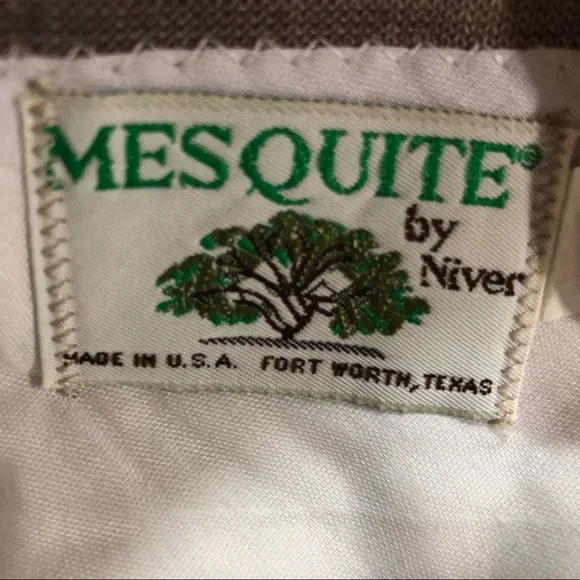 Mesquite by Niver VINTAGE small tan 3 piece mens suit, size 28 waist. Coat is lined with a silky tan color & has arrow stitched type design on front & back, vest is lined with silky brown color. Made in U.S.A. Fort Worth, Texas.