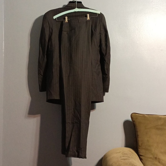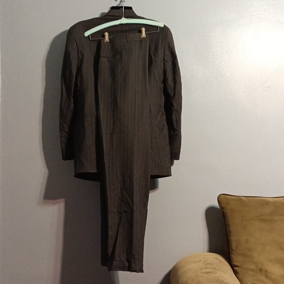 Unlisted a Kenneth Cole production charcoal gray with light gray pinstriped suit, pants has a pleated front and cuffed bottom legs, pants had a tear on the front right leg I took it to the cleaner and had it stitched check out pictures, 100% wool shell,100% acetate lining suit, size 42"L, 36" W, my measurements waistline 38", inseam inner crotch area 32.5", from waistline to hemline outer seam 45", blazer from pit to pit 46", from shoulder to hemline 32.5", buy a suit get a free tie. Bin#139