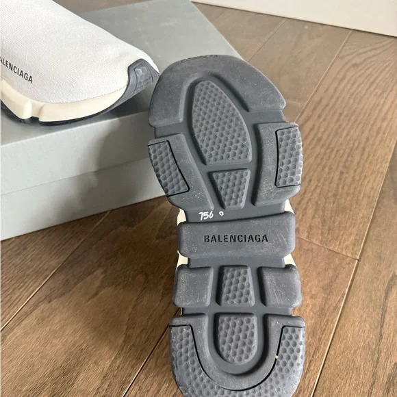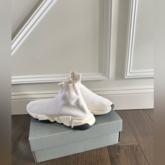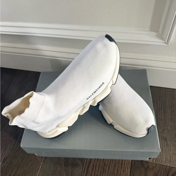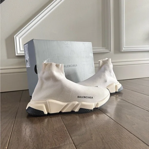 Genuine Balenciaga speed trainers track Size 10 off white Balenciagas sock sneakers100% authentic. Preloved condition hence lower price. Have some signs of wear but nothing major. Still plenty of wear left. Please see the photos. Good condition