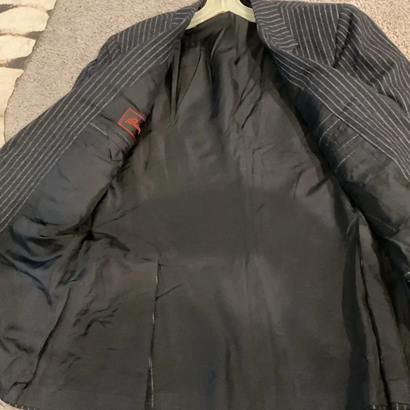 Brioni Nomentano Vintage Navy Pinstripe 100% Wool Sport Coat Suit Jacket Blazer Y2K sz 52, or US Sz 42 R, Like New condition, two button, amazing dress sportcoat! Brioni logo adorn the inner lining. Great for any Christmas or holiday party, work, office, professional, workwear or wedding!Measures pit to pit is 21”, shoulder seam to end of arm is 23.5’”. Will ship right away. Check out my other BRIONI suit jacket consolidation