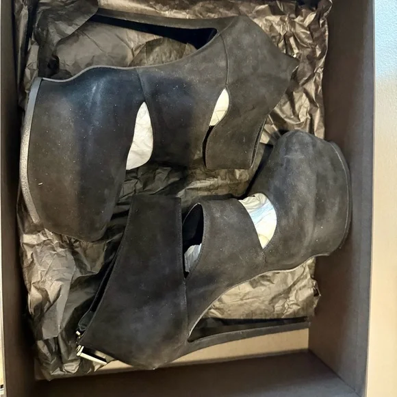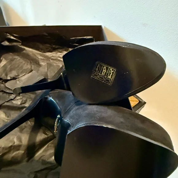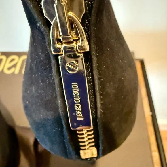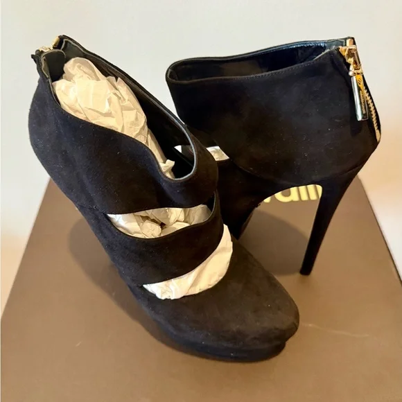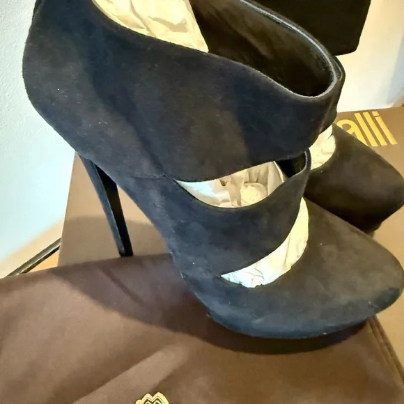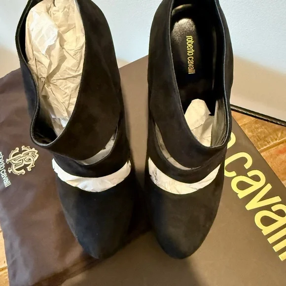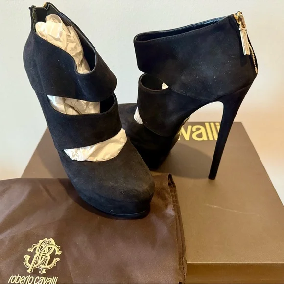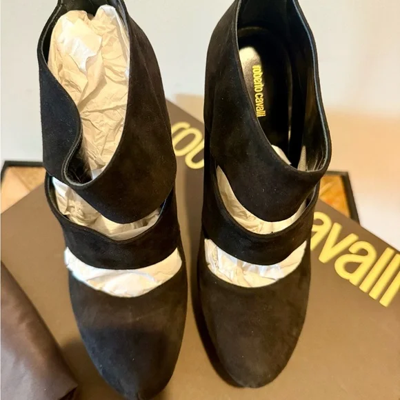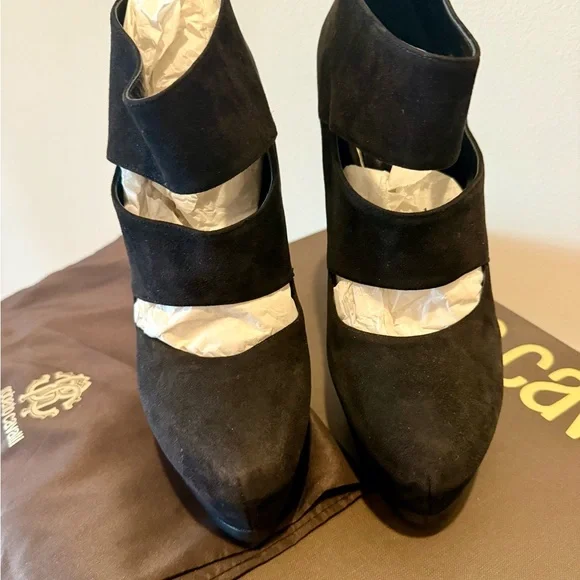 Step into elegance with these Roberto Cavalli black heels, featuring a striking cut-out design and a sleek pointed toe. Crafted from a soft suede-like material, these slip-on heels offer a sophisticated look for any occasion.