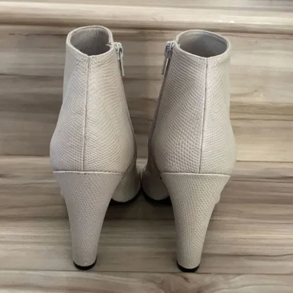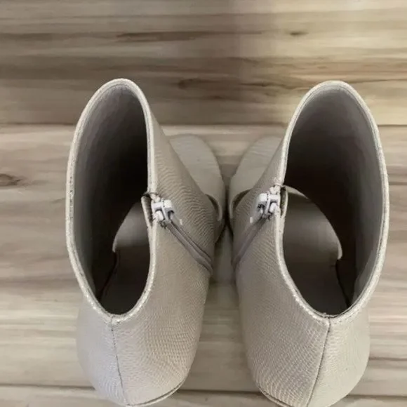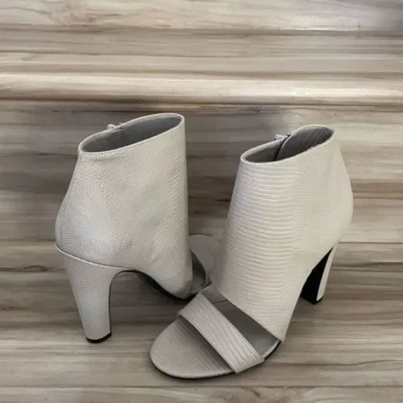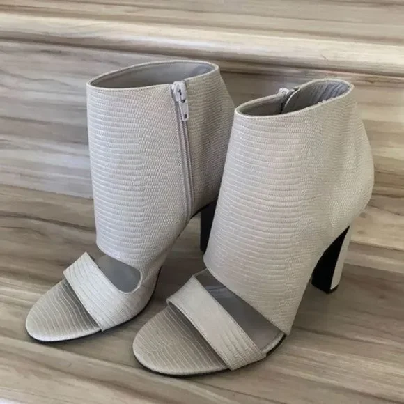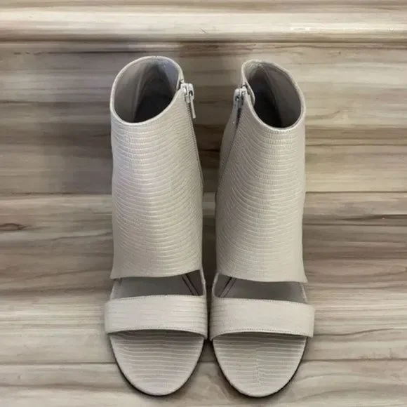 Vince Sansa open toe booties New without box Snake embossed open toe Covered heelHeel height: 4 1/4”Side zipper Size 38Leather upper lining & soleCheck picture for more details Note : unnoticeable tiny spot right shoe due to storageColor : light grey