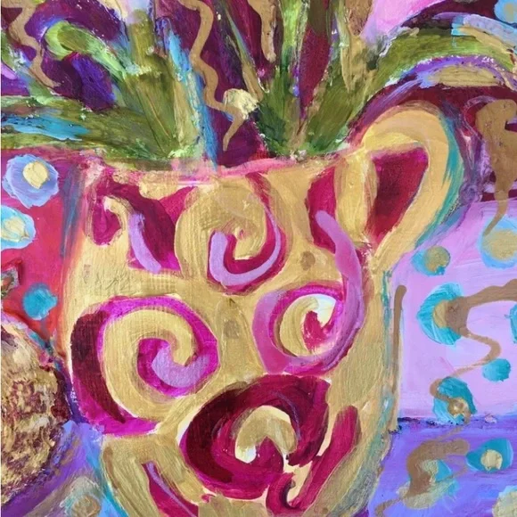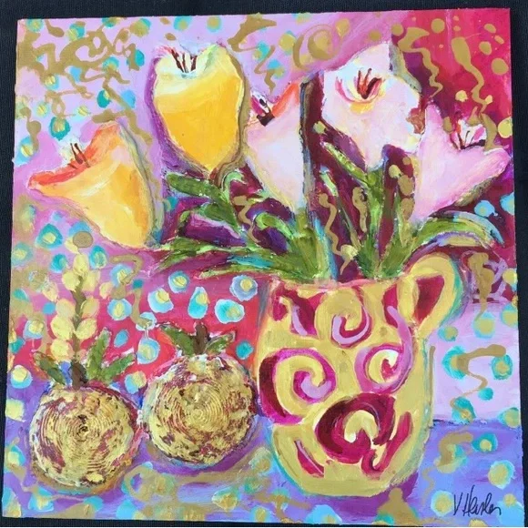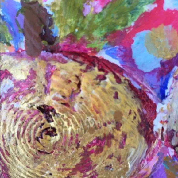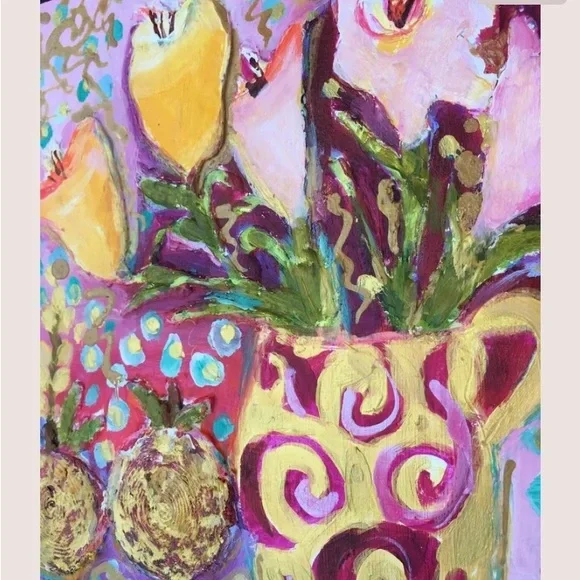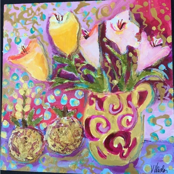 This mixed media acrylic painting combines paper clay (built up surface on flowers and apples) as well as acrylic paint, and metallic acrylic inks It is perfect for your art...