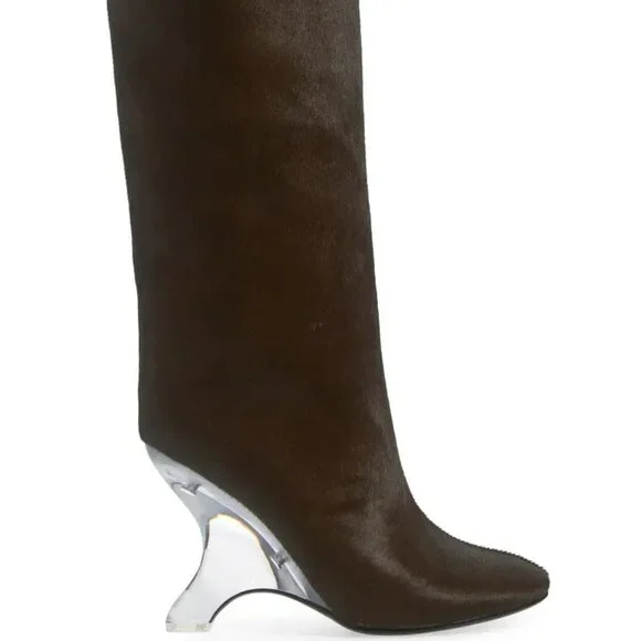 Size info:True to size.Details & care:A sculptural clear wedge heel serves as an intriguing focal point for this knee-high boot crafted in a minimalist silhouette from silky genuine calf hair.4 1/2" heel.16 1/2" shaft; 15" calf circumference.Inset side-zip closure.Genuine calf hair (China) upper/textile and leather lining/synthetic sole.Imported.