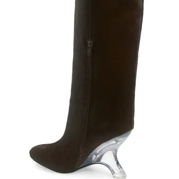 Size info:True to size.Details & care:A sculptural clear wedge heel serves as an intriguing focal point for this knee-high boot crafted in a minimalist silhouette from silky...