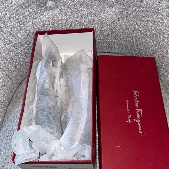 These Salvatore Ferragamo flats showcase a refined black finish with a charming bow accent on the front. Designed with a pointed toe and a low heel, they offer a sophisticated...