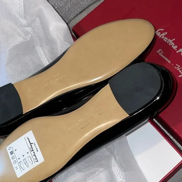 These Salvatore Ferragamo flats showcase a refined black finish with a charming bow accent on the front. Designed with a pointed toe and a low heel, they offer a sophisticated look suitable for various occasions. Crafted with premium materials, these shoes promise both elegance and comfort.