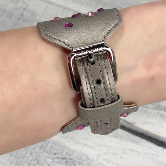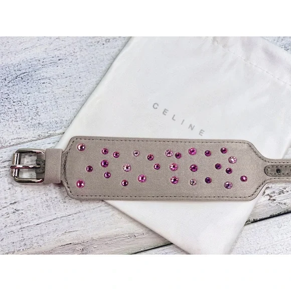 Authentic Céline Crystal Encrusted Leather Cuff Bracelet is crafted from calfskin leather in a metallic silver color with ombré pink Swarovski crystals that dance in the light! It has an adjustable buckle strap and silver-toned hardware. This bracelet is in excellent condition and comes complete with the original dust bag. Measurements: Length: 9.5”Width: 2”•Reasonable Offers Considered•Will Trade with Experienced Traders