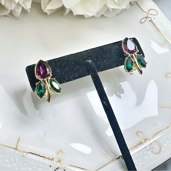 Authentic vintage Givenchy Purple Crystal Tulip Clip-On Earrings….These elegant earrings feature a stunning combination of purple and green Swarovski Crystals set in a...