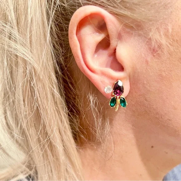 Authentic vintage Givenchy Purple Crystal Tulip Clip-On Earrings….These elegant earrings feature a stunning combination of purple and green Swarovski Crystals set in a gold-toned finish. They have clip-on backings with the designer’s hallmark engraved on both the earrings and the backside of the clip. They are in excellent vintage condition but come with no accessories. Please observe all photos as part of the description. •Offers Welcome