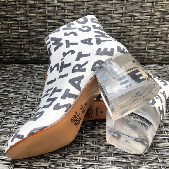 New MM6 Maison Martin Margiela Text Print Ankle Boots.Retail $840.00.Size: 36EU.Color: White.Heel Height: 2.75".Text print details.Lucite transparent block heel.Round toe.Side zip closure.Textile/Cotton Canvas upper.Leather lining and sole.Made in Italy.Box not included.