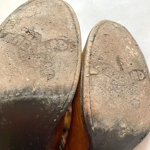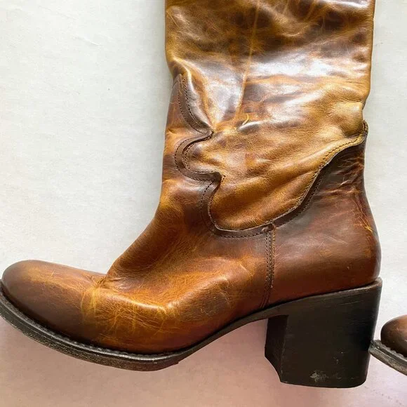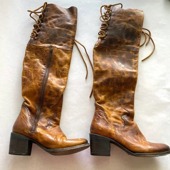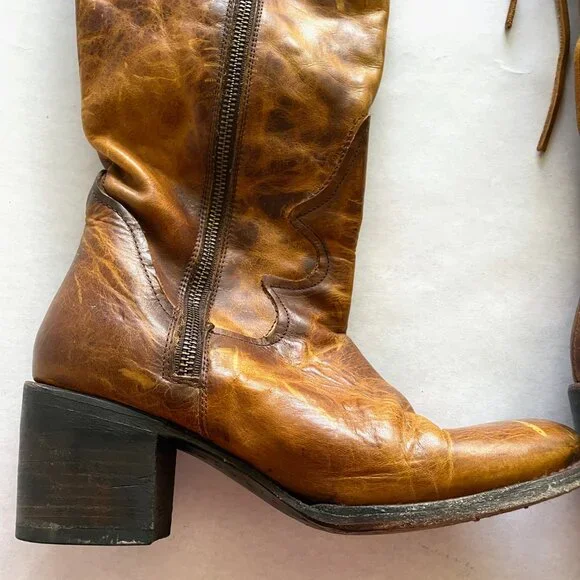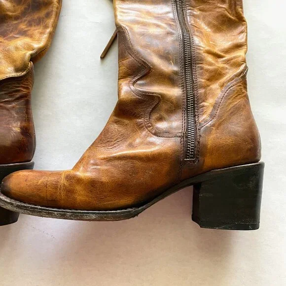 Beautifully distressed leather boots, women´s size 9. Zip closure with lace up top/back. A few scuffs and scratches from normal wear as pictured.