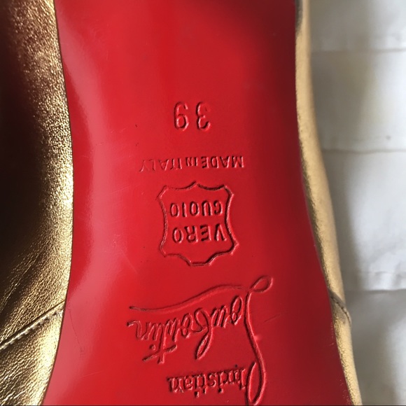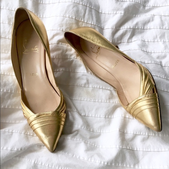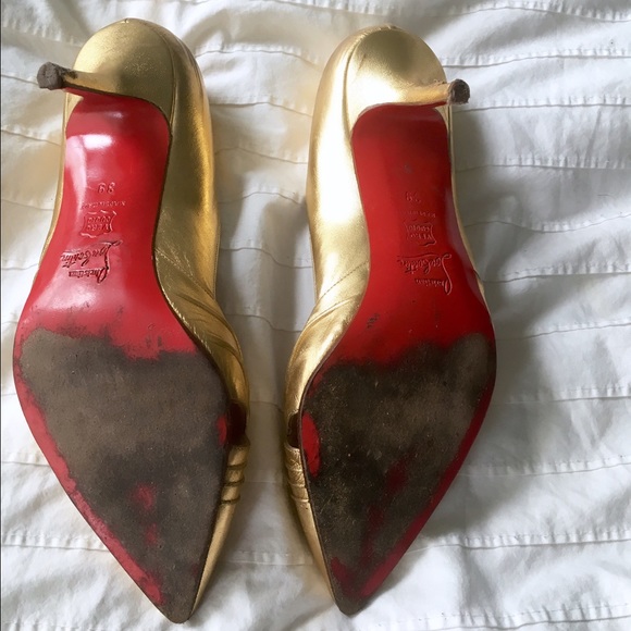 Lovely gold Louboutins. Short heel. Not worn much but bottoms scratch easily.Size 39 I typically wear an 8.5 US size.