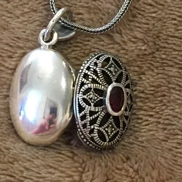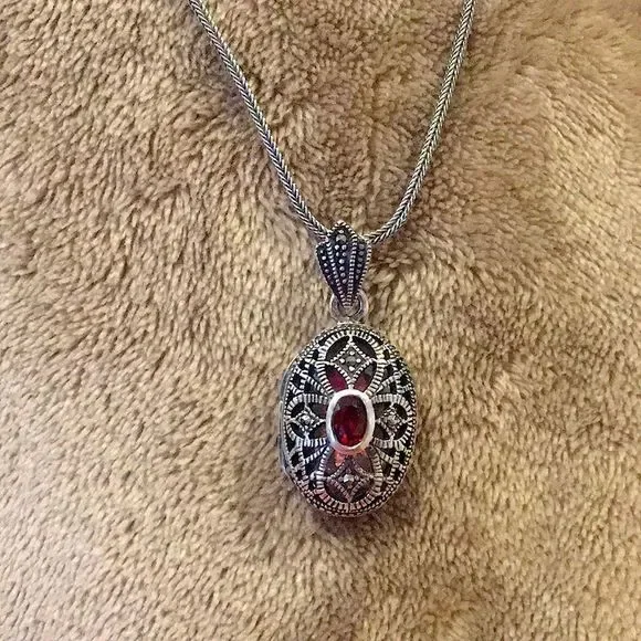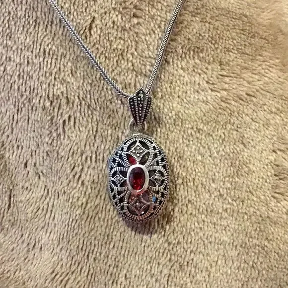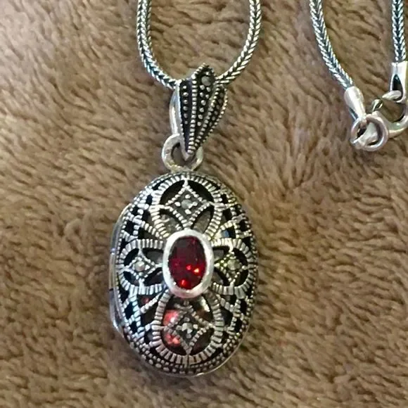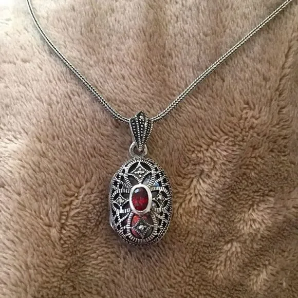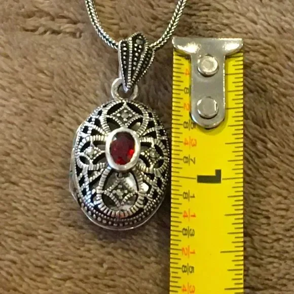 Red Garnet Marcasite Locket Sterling Silver Filigree Design