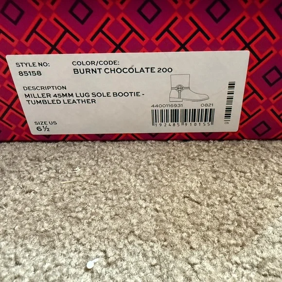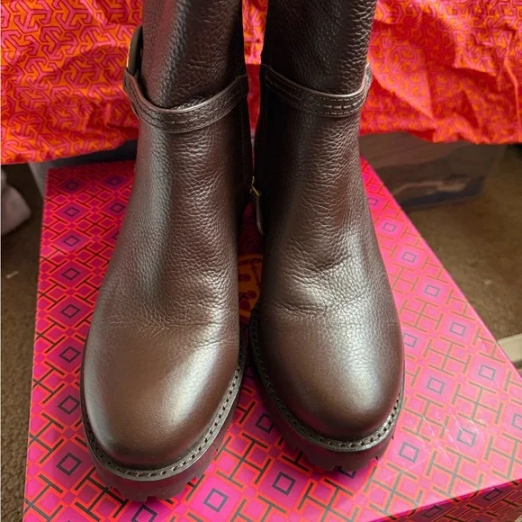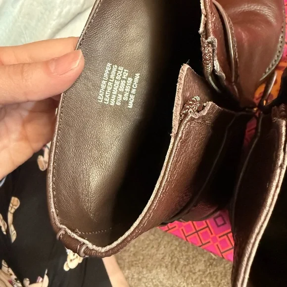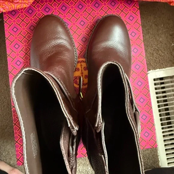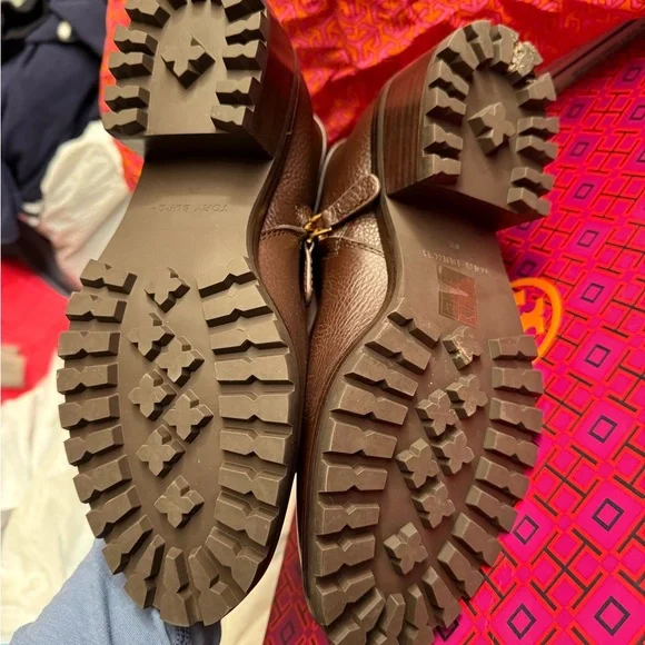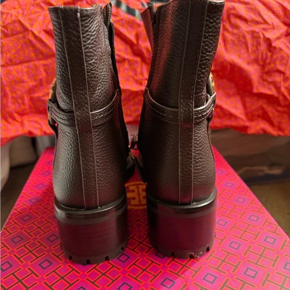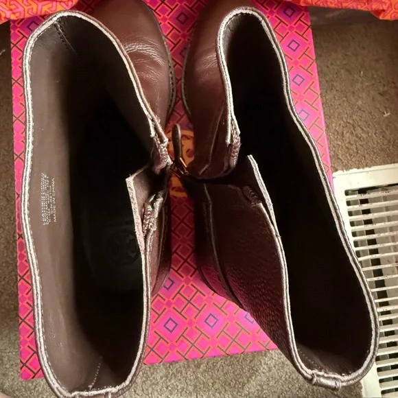 Step out in style with these Tory Burch brown leather ankle boots. Featuring a sleek design and a signature gold logo accent, these boots are perfect for any occasion. Size 6.5