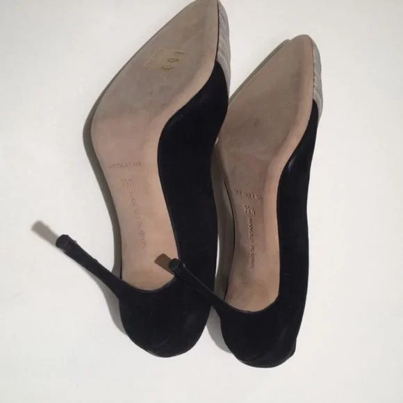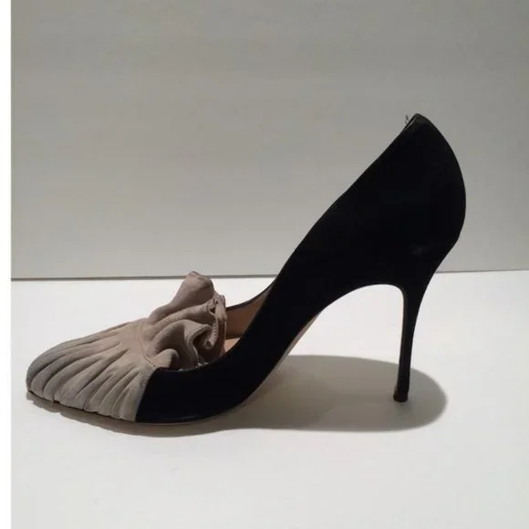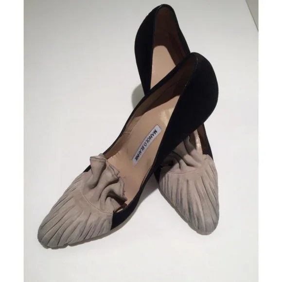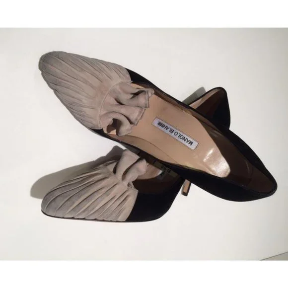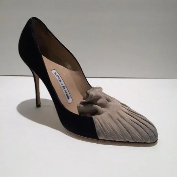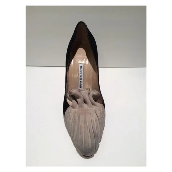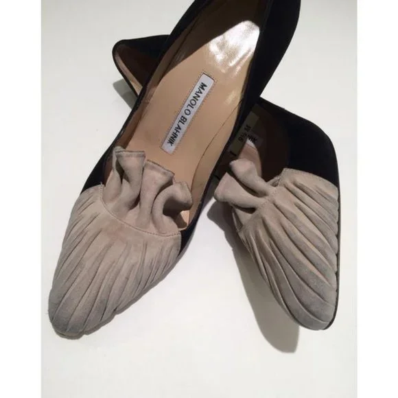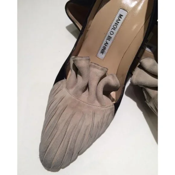 Manolo Blahnik Arleti Frill Detail Suede Leather Pumps.Retail $950.00.Size: 39.5 EU.Heel Height: 4.25".Color: Black/Ivory.Almond toe with a gathered detailing that connects to a fan decoration in front that can be worn fanned out or pulled up.Genuine suede leather upper.Leather lining and sole.Made in Italy.Condition: Store Display Shoes with Stains/Scuffs.Box and Dust Bag Not Included.