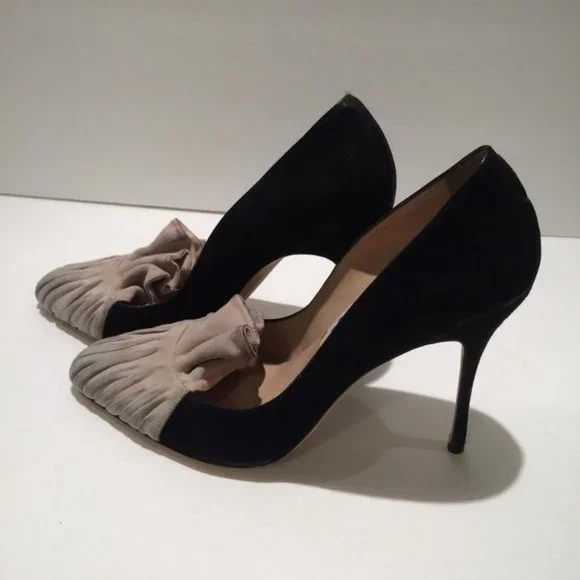 Manolo Blahnik Arleti Frill Detail Suede Leather Pumps.Retail $950.00.Size: 39.5 EU.Heel Height: 4.25".Color: Black/Ivory.Almond toe with a gathered detailing that connects to a...