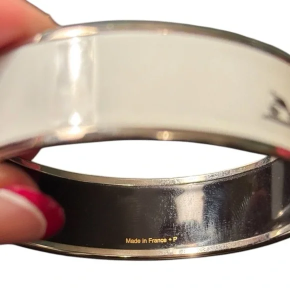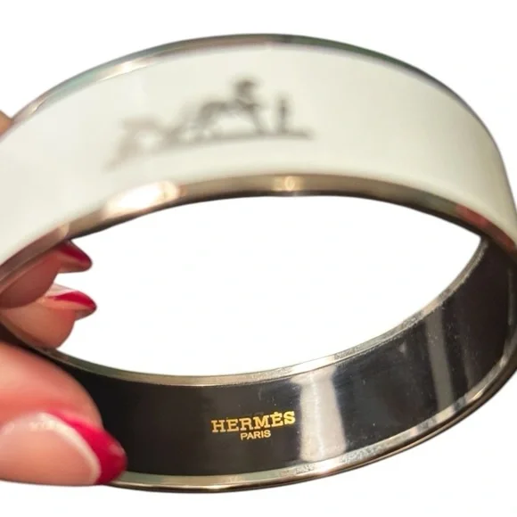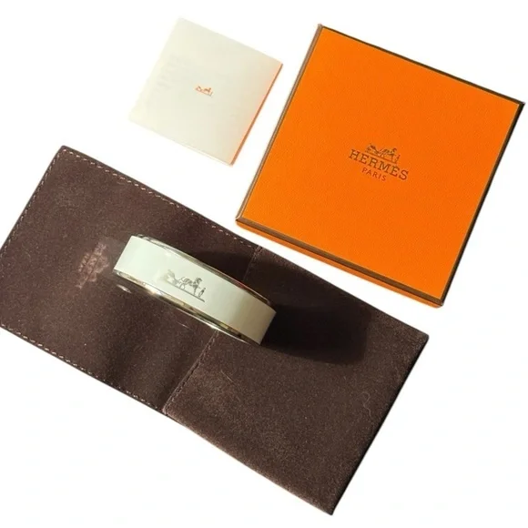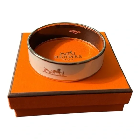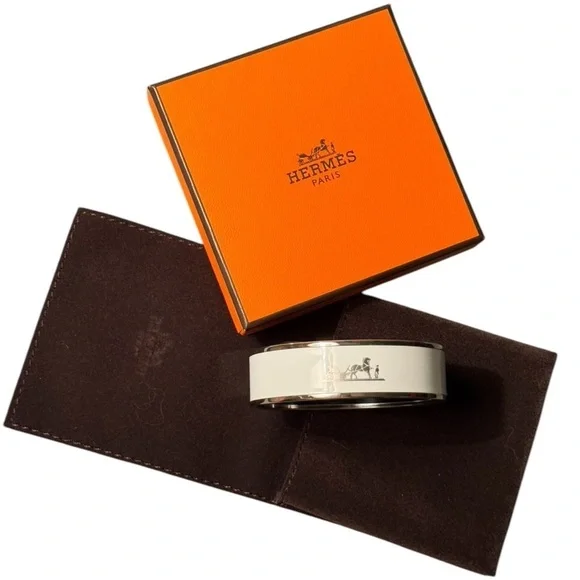 Authentic Hermes bangle in excellent condition!! Only worn a handful of times. Palladium plated. Includes original jewelry pouch, box, info sheet, and ribbon.I’d be happy to answer any questions or add additional photos.