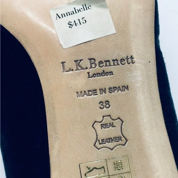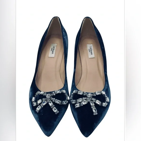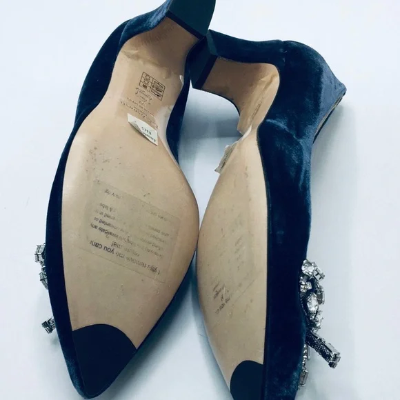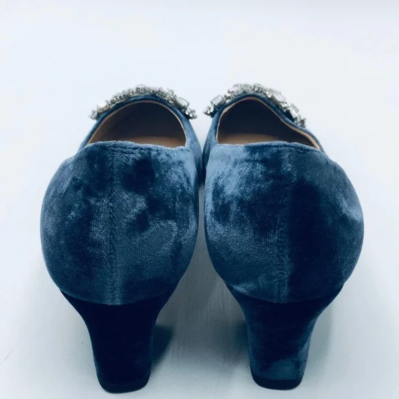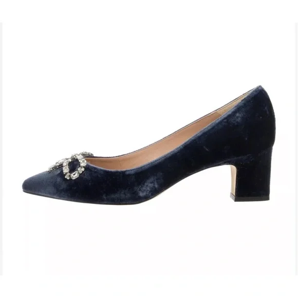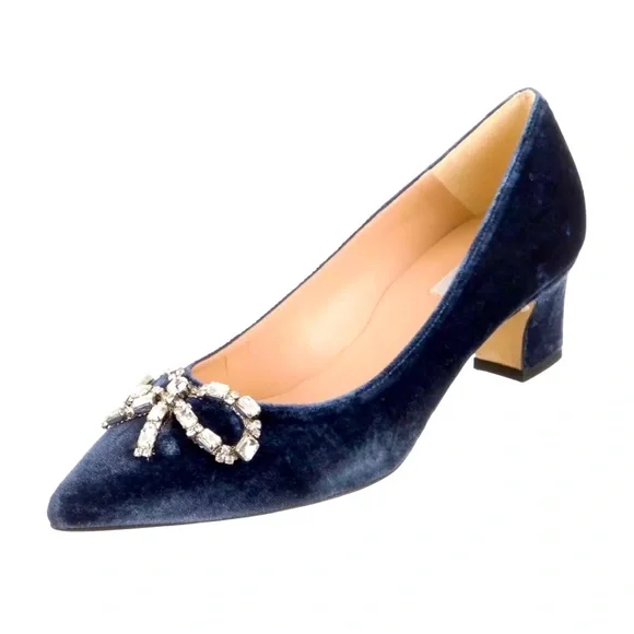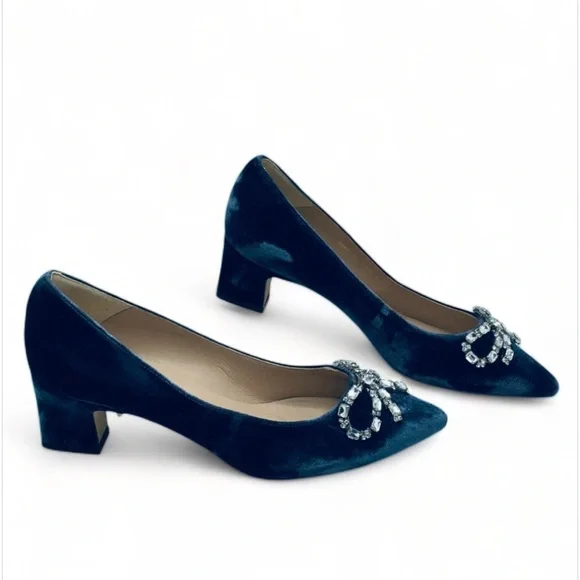 Blue velvet L.K. Bennett Annabelle pointed-toe mid-heel pumps with embellished crystal bow accents at vamps and covered heels.Heels: 2.25"EU Size: 38New condition!