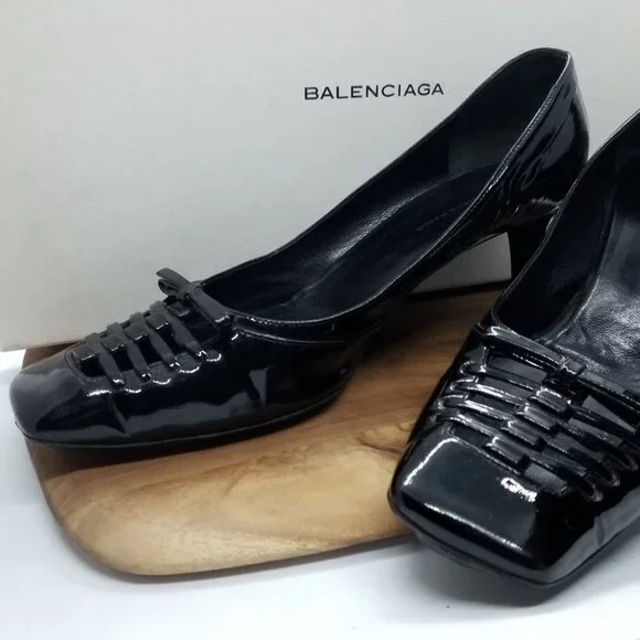 Black patent leather Balenciaga kitten heels with delicate bow detail in US size 7, Euro size 37 are gently worn, stylish designer shoes.