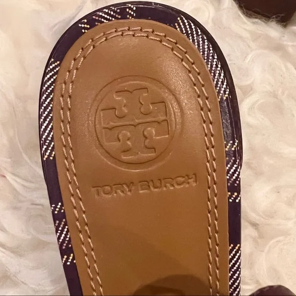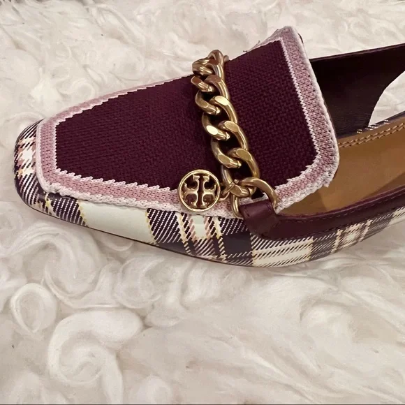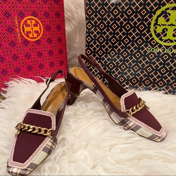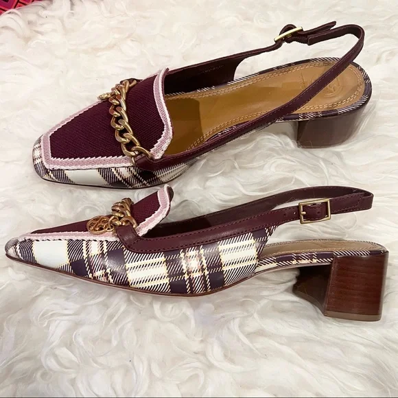 - Plaid Printed Calf leather- Claret woven textile front with gold chain and signature double T logo charm- Stacked heel / Block heel- Square toe- Leather lining and soleSize: 7Heel: 1.9”Brand new with box