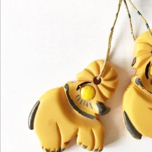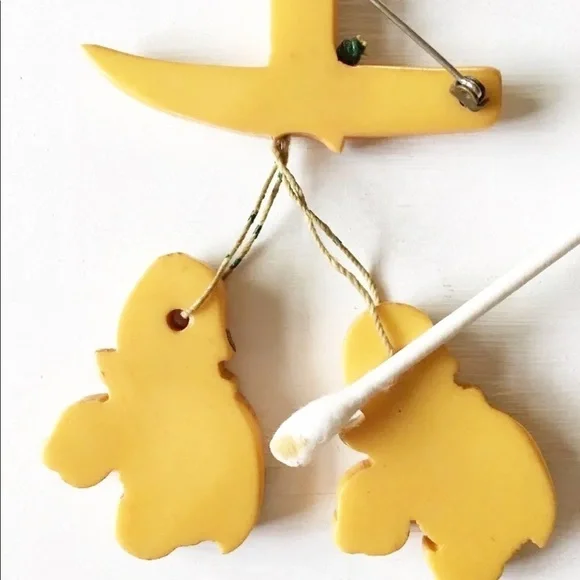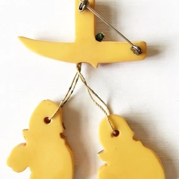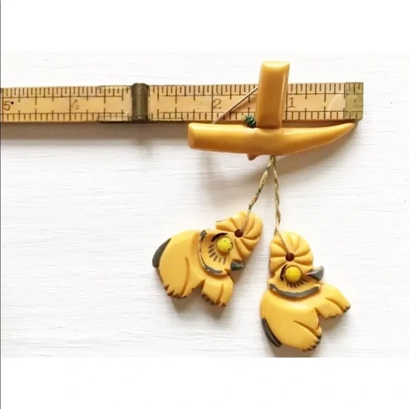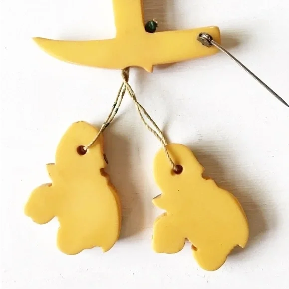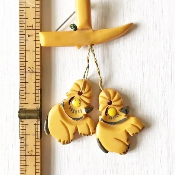 Unique Bakelite Brooch with two dangling Butterscotch carved elephants.Tested positive with Simichrome Polish.