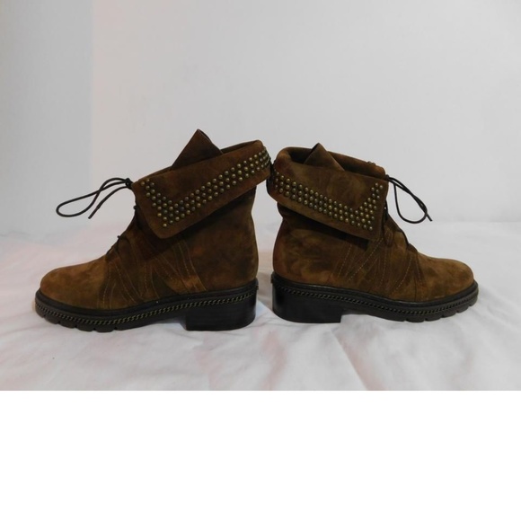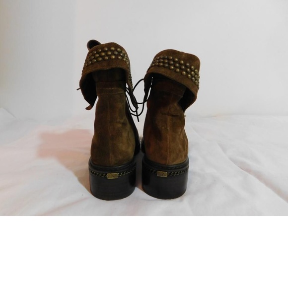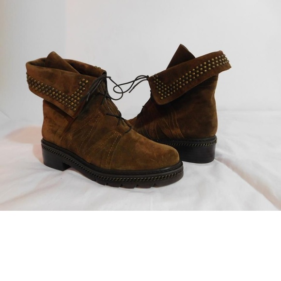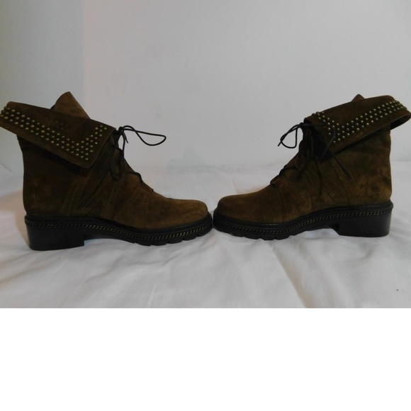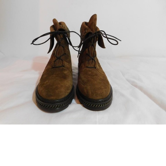 New without box Unique lacing, studded foldover collar details, and a chain trimmed midsole.Sizing: True to size.Round toeLace-up closureLeather constructionStudded foldover collar trimTopstitched detail Lug soleApprox. 1.50" heelMade in SpainSuede upper, leather lining and rubber sole1st quality authentic and non smoking.Price sticker residue on bottom soles.