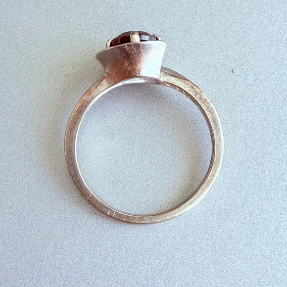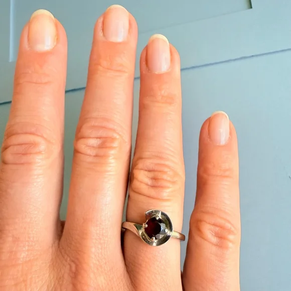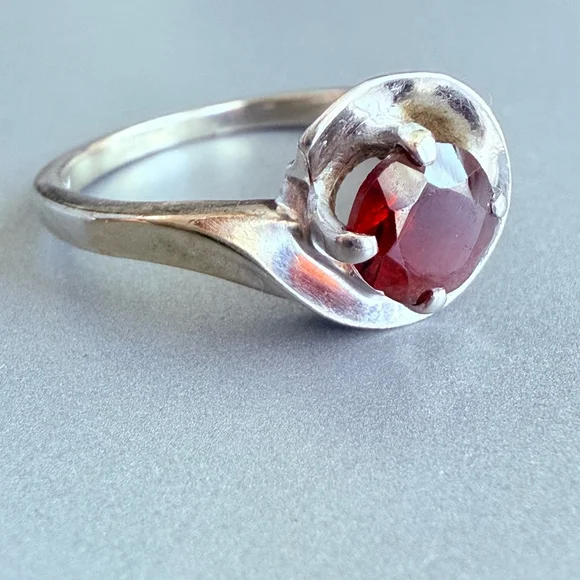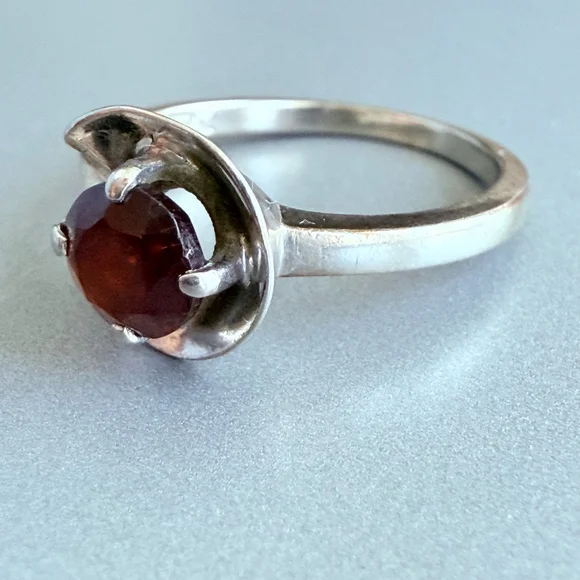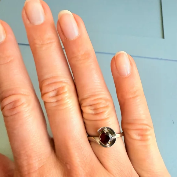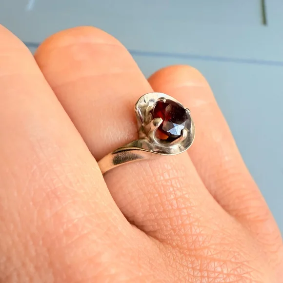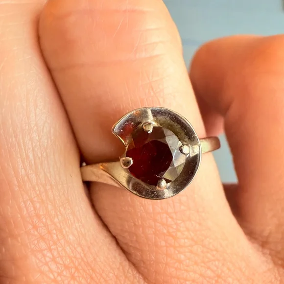 Embracing modern geometrical symmetrical sreamlined design with a 3/4 moon sphere around the centered beautiful red garnet. Garnet round cut solitaire faceted stone is approximately .92 carats. Mid Century period ring made in 10K solid white gold. Stunning!Size 5.52.3 grams total weightRing is marked 10K & H & K(Makers Mark)Make sure to see all the pictures. This piece is pre-ownedA280 - 170Tiffany & co, Yurman, John hardy, Scott , Konstantino, Trifari, vintage, antique, taxco, Jensen, Navajo, Kendra Scott, Pandora, trollbeads, bvlgari, Cartier, sajen, ring, necklace, bracelet, Roberto coin, Heidi Daus, gold ring, gold necklace, chain, gold chain, 14k, 10k, 18k, earrings, hoops, hoop earrings, chandelier earrings, gemstone, Diamond, solitaire, Native American, jewelry, jewellery, Stud earrings, Lagos, Pandora, charm, brooch, Trifari, vintage, antique, Jensen, Navajo, Kendra Scott, Pandora, trollbeads, sajen, mikimoto, swarovski, tacori, buccellati, taxco, Native American, Zuni, estate, pollack, bisbee, ring, necklace, brooch, bracelet, king baby, Kenneth jay lane, chrome hearts, silpada, Napier, Sarah coventry, krementz, carolee, heidi daus, mejuri, , Agmes, francesca villa, Sophie Brahe, prounis, pariah, erede, jolly bijou, alexis bittar, sauer, alex and ani, Charles garnier, h stern, Anna sheffield, Kramer, hobe, Haskell, eisenberg, schiaparelli,, Carnegie, bogoff, loree rodkin, hatton labs, good art hlywd, Ross Simons, Lagos, monet, Coro, Weiss