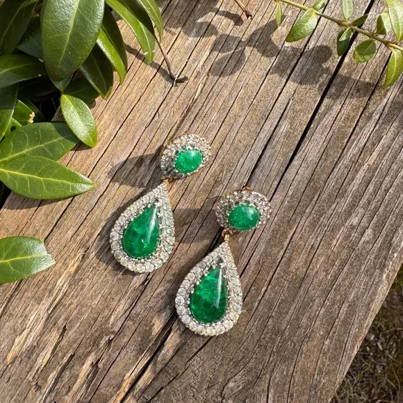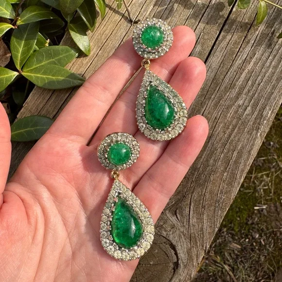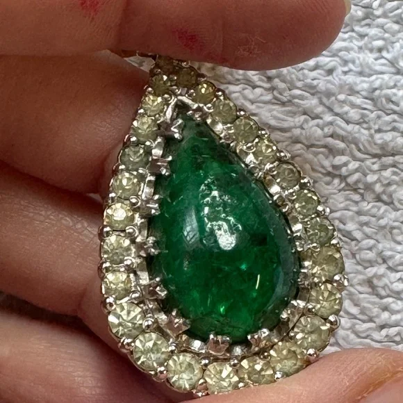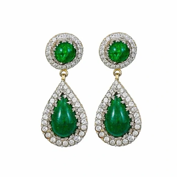 Vintage circa 1950s Nettie Rosenstein Old Russian style faux emerald poured glass paste gold tone clip on earrings 2” long.Signed Nettie Rosenstein on one earring.Good preowned condition (some surface wear, glass cabochons have naturally uneven surfaces, please refer to the photos)Please note that all vintage pieces are expected to have slight imperfections.If you have any further questions please message me prior to placing your order.Thank you!