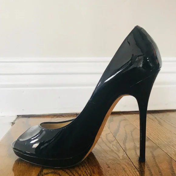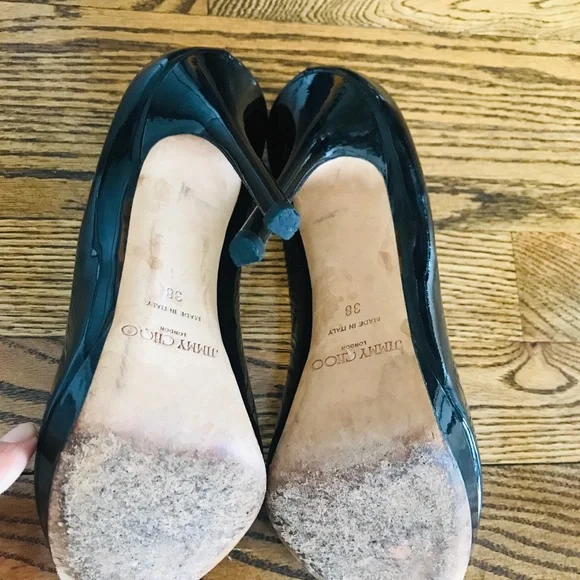 Classic black patent leather peep toe jimmy choo Size 38 in almost perfect condition besides the wear on the bottom of the shoe. Questions? Leave a comment below!