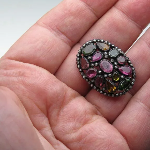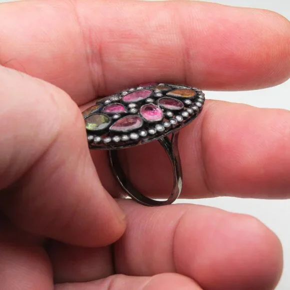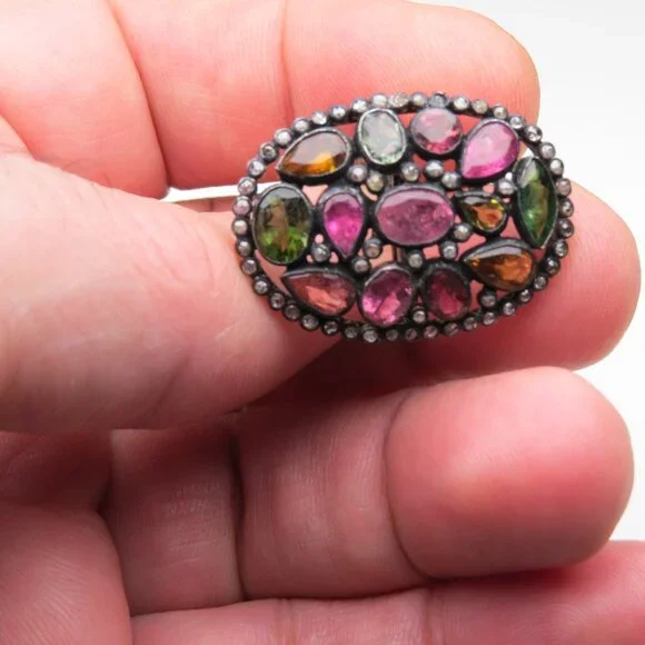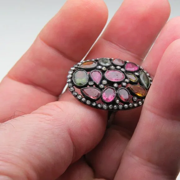 Diamonds-1/2ctMulti colors Turmalines-12ctSterling silver Antique finishsize-8 ( could be resized by any jeweler)