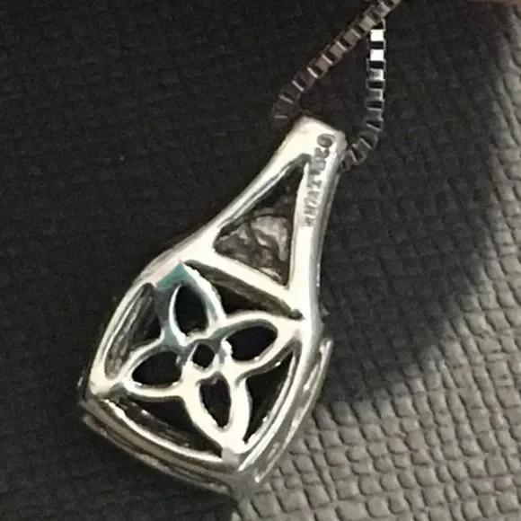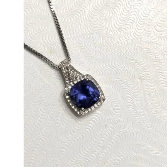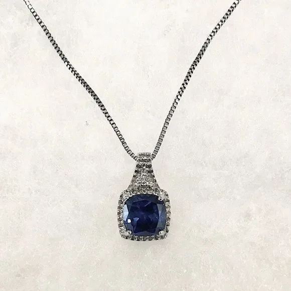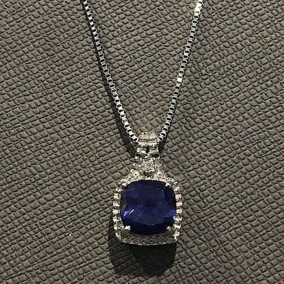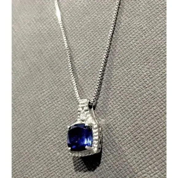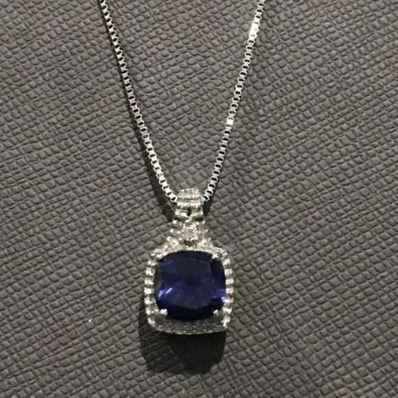 Blue Sapphire Diamond Pendant Sterling Silver Box Chain Necklace 18” long