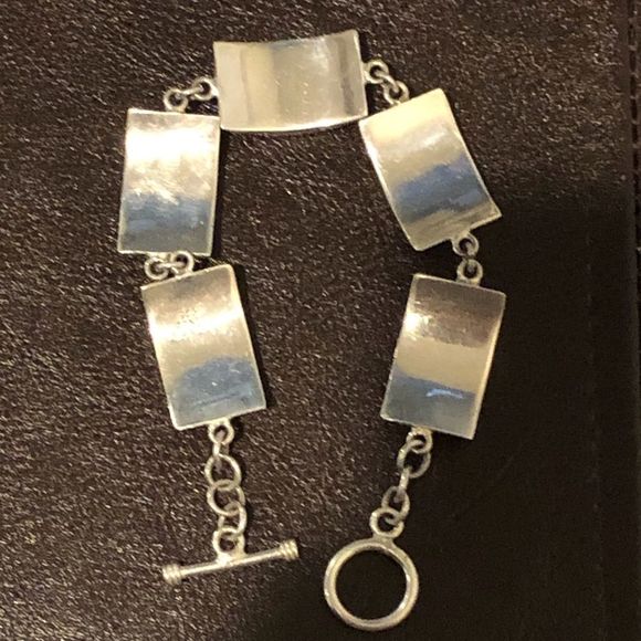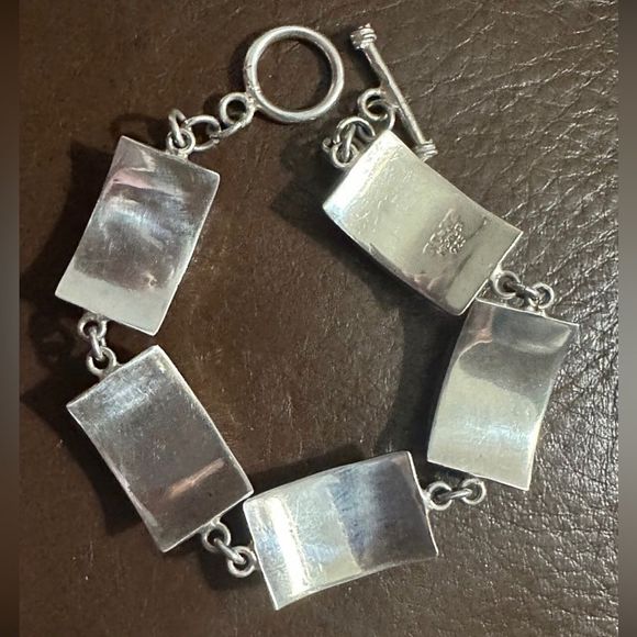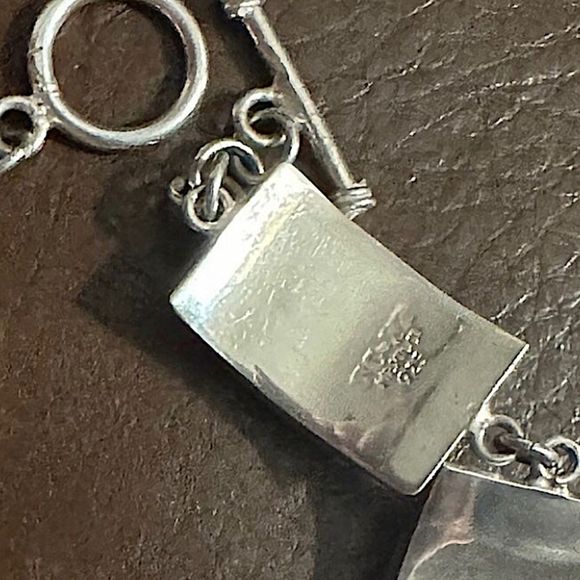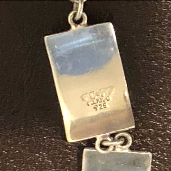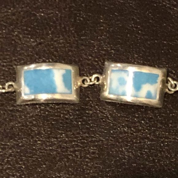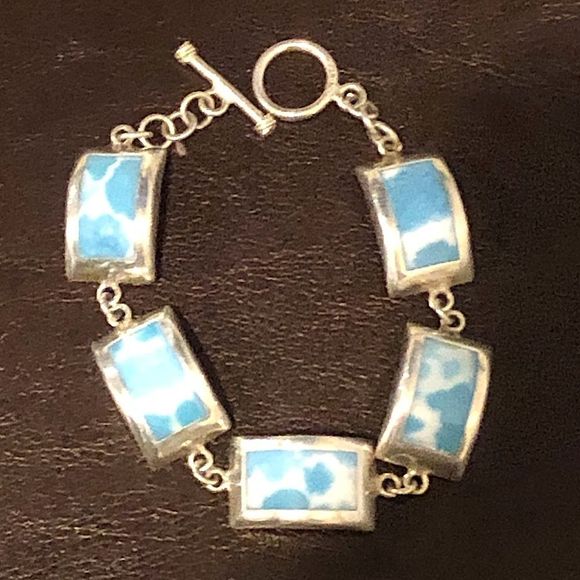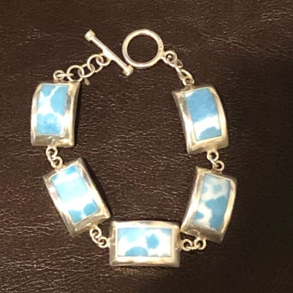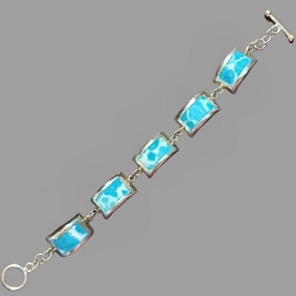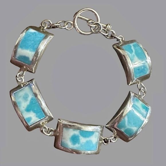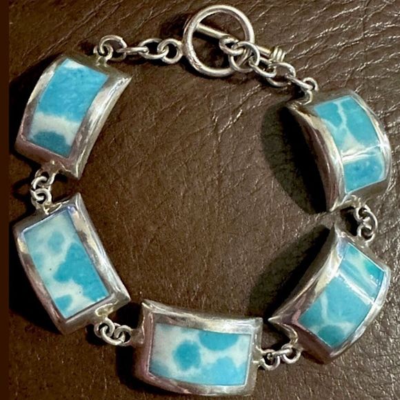 TAXCO Sterling Silver Larimar Cabochon Link Toggle Bracelet Larimar Cabochon Gem Stones Linked Together To Create a Hearty Artisan MEXICAN Hand Made BraceletColor: Silver, Blue, White Accent in LarimarClasp: Toggle ClaspMarked: MEXICO, 925Measurements of Bracelet Taken Flat By HandsApproximate Measurements:Length: 8 inches LongWidth: 3/4 inch WideWeight: 33.8gCondition: Vintage PreOwned ConditionAsk Questions and/or Request Additional Photos, Measurements as NeededColor May Vary Based on Shadows, Lighting, Monitor, Display Settings$325