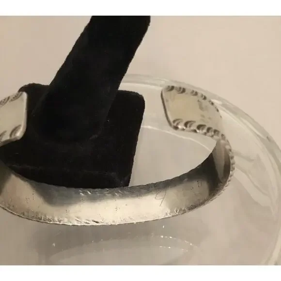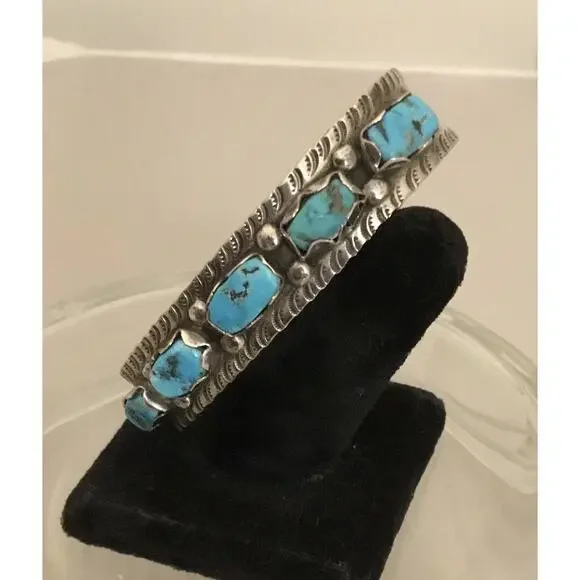 This vintage Navajo sterling silver cuff bracelet is a stunning piece of jewelry that showcases five beautiful turquoise stones. The bezel setting style adds to the overall...