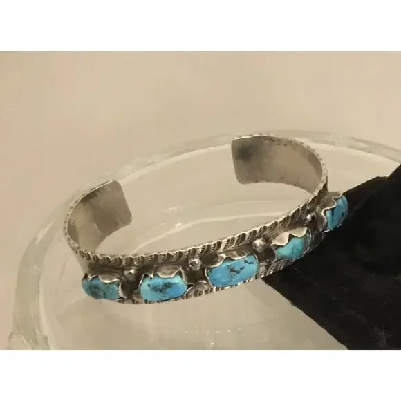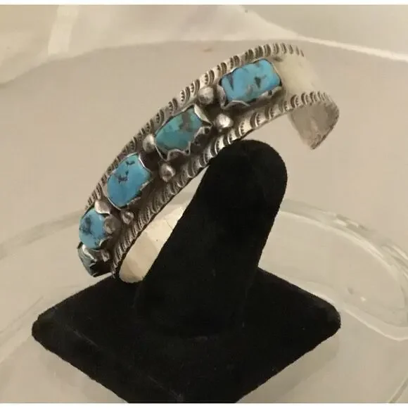 Vintage Navajo Sterling Silver 5 Stone Turquoise Stamped Cuff Bracelet 32g