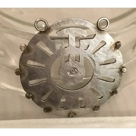 This stunning pendant is a piece of Taxco jewelry made by Rafael Melendez, dating back to before 1946. Crafted in 980 sterling silver, it features a beautiful bezel set cabochon amethyst. It is handmade and signed by the artist.Diameter: 2.25”