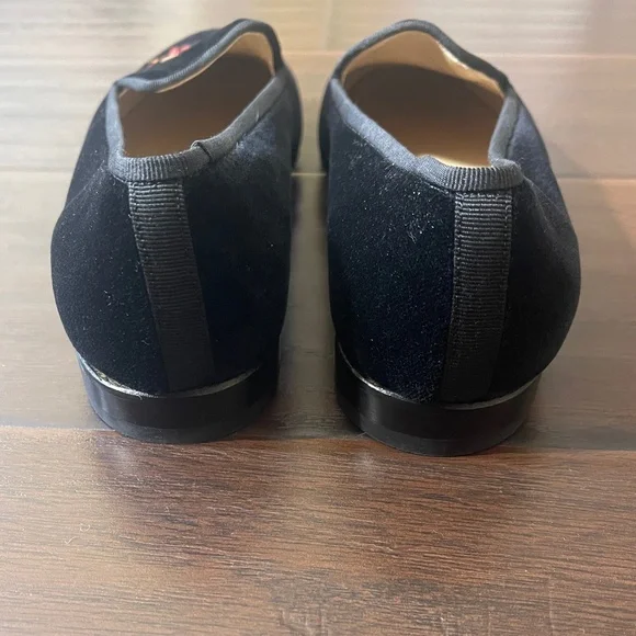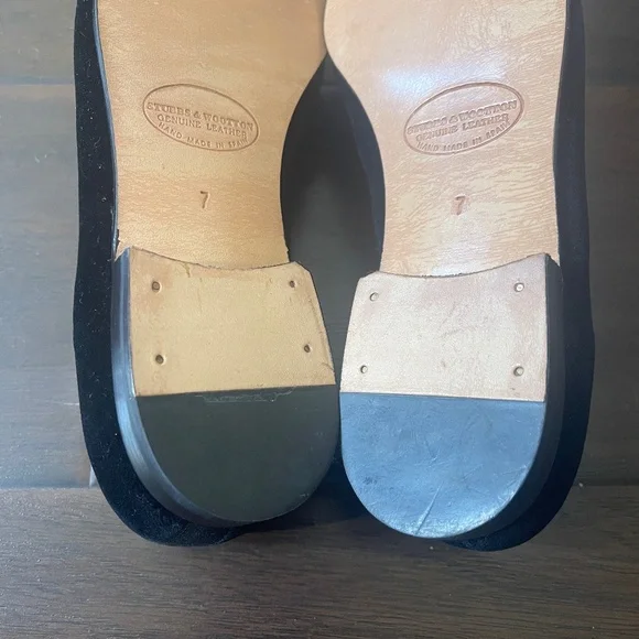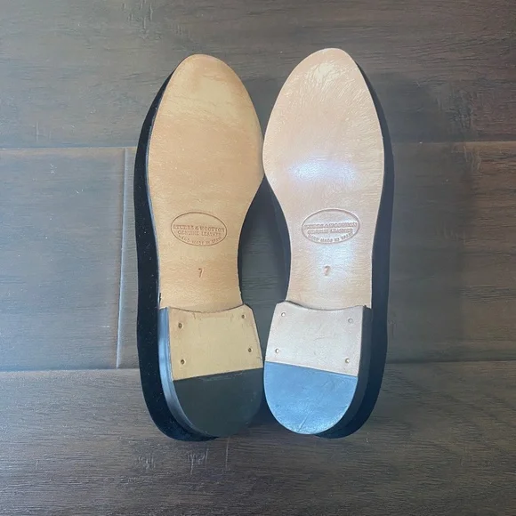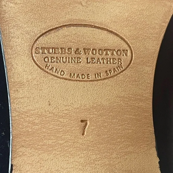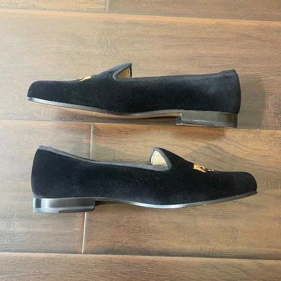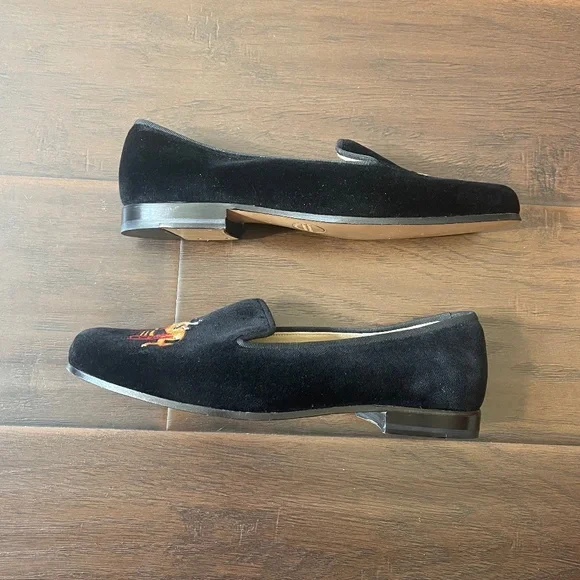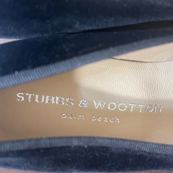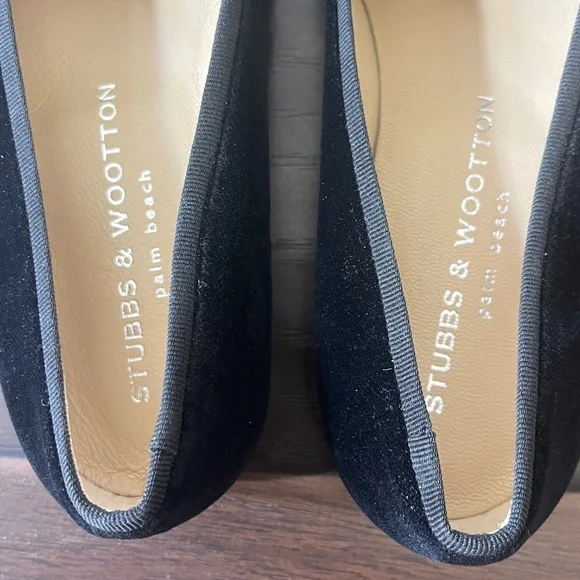 Stubbs & Wootton Women´s Velvet Equestrian Slippers Loafers Shoes Sz 7 EUC!This is a beautiful steeplechase, horse jumping, equestrian needlepoint design on black velvet. It is in excellent pre-owned condition; it was tried on once and has very minimal signs of wear. Looks new!No stains or holes. Super clean inside/out.Fits true to sizeDoes not come with the original box or dust bag.interior is genuine leathermade in Spain